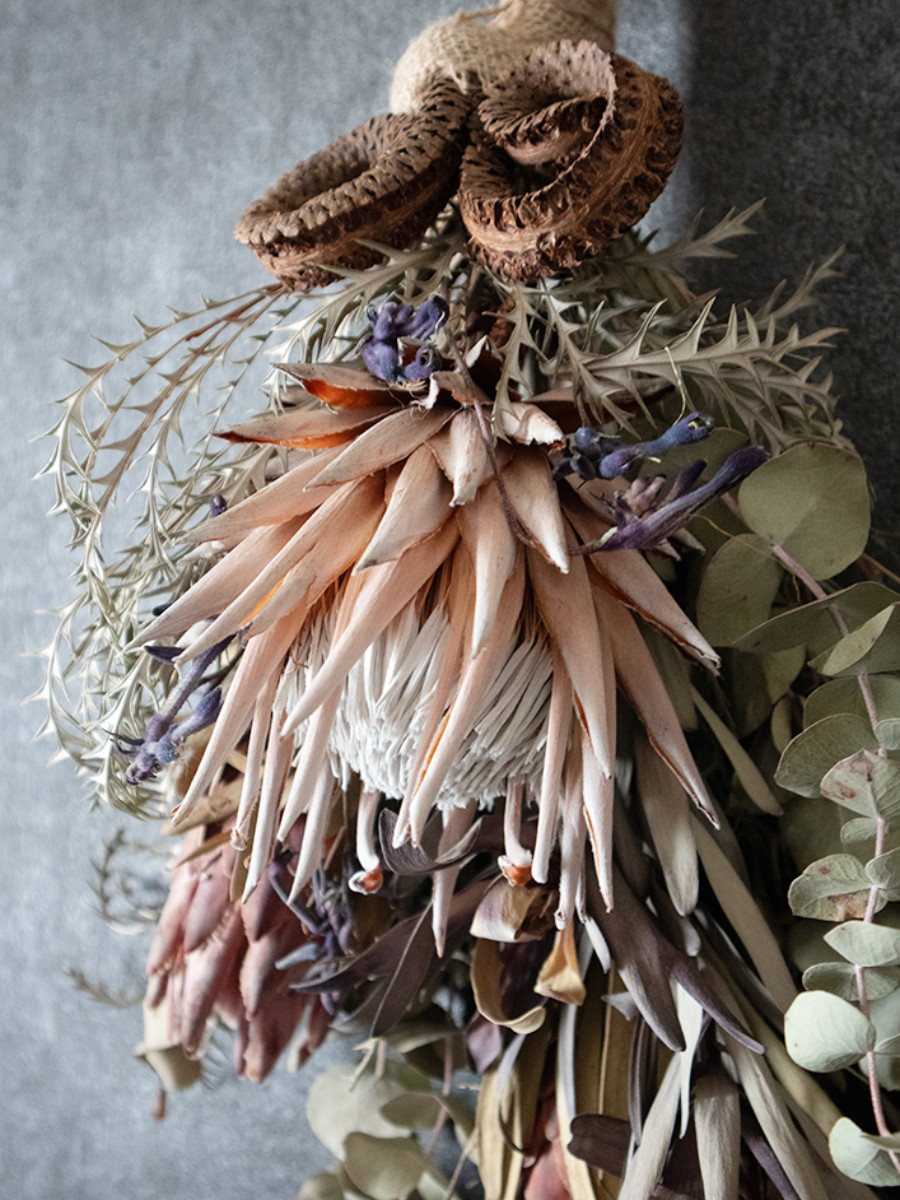 青いカルガルーポーとピンクプロテアのコントラストが美しい、ヴィラン感のある花束スワッグ。