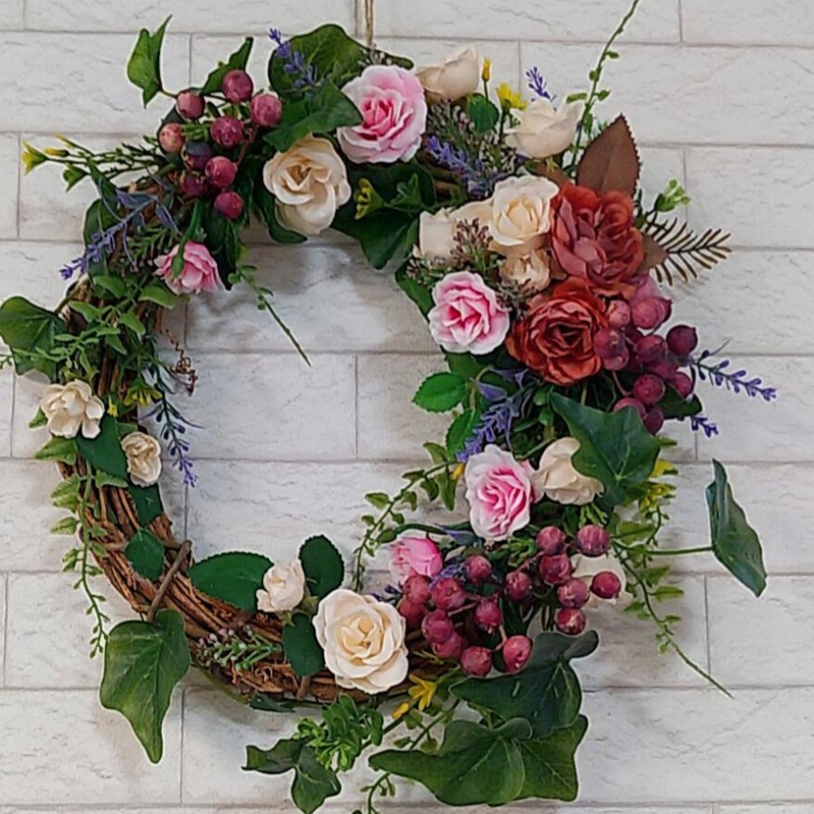 ばらをメインに,深紅のばらをメインに,上品で落ち着きのあるリースを作ってみました。同系色のベリーの実を組み合わせることで,より趣のある作品に仕上げることができました。秋に向かうこれからの季節にちょうどぴったりなリースです。