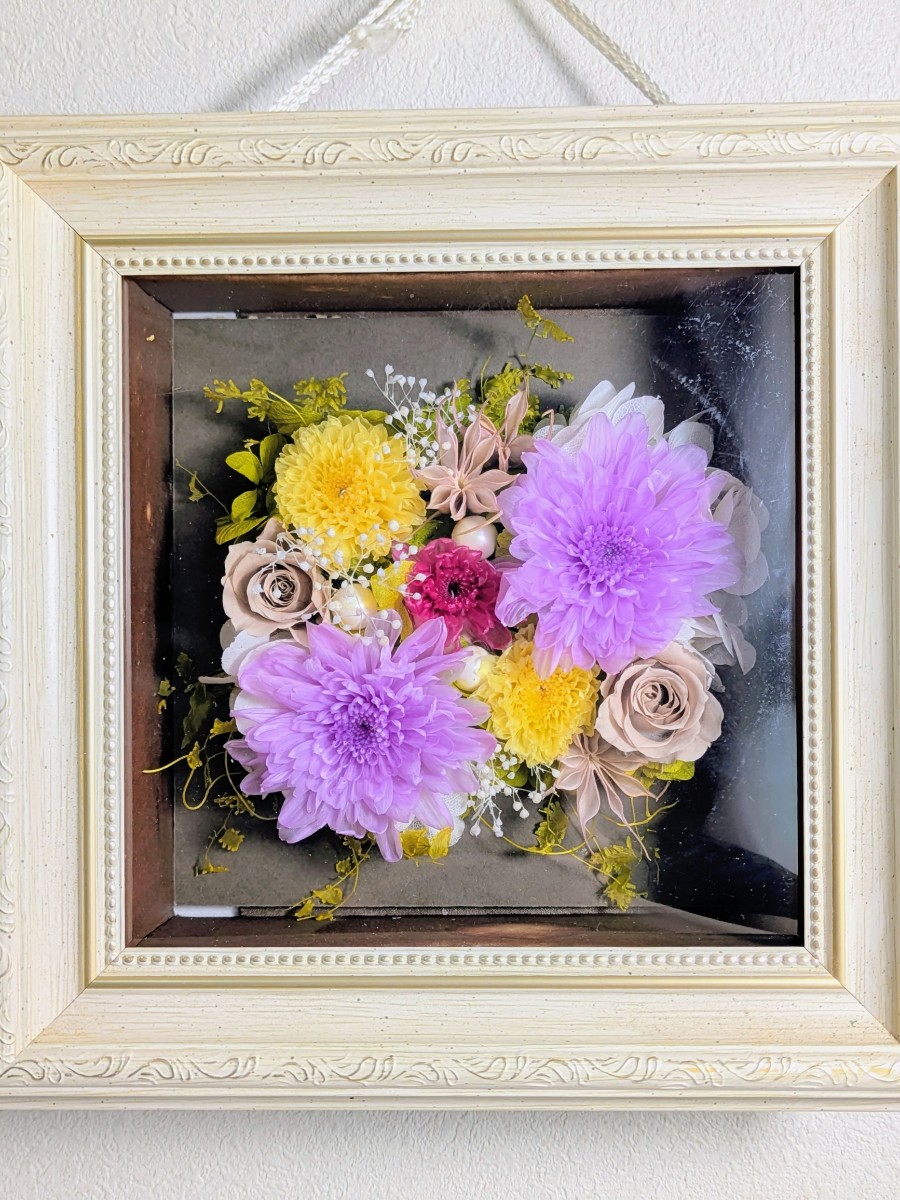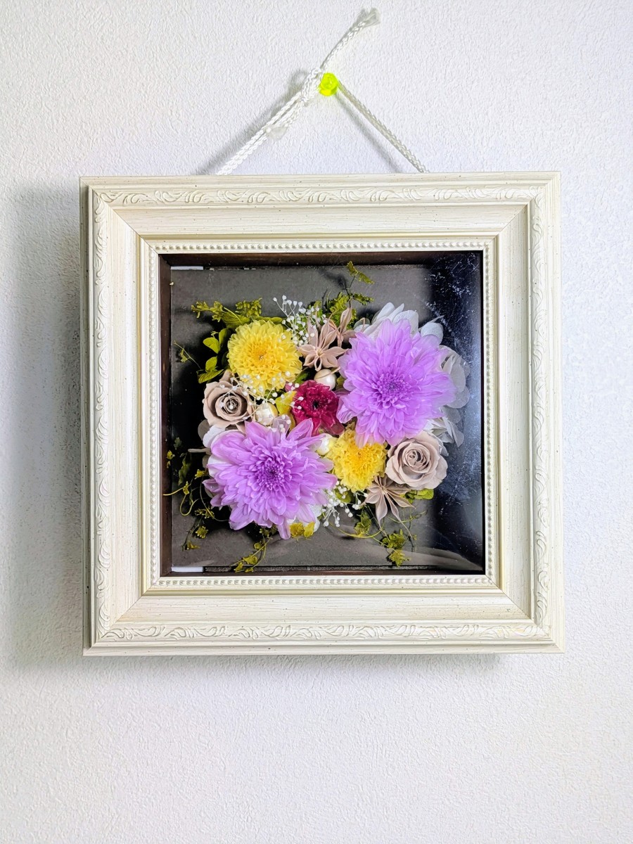 プリザーブドフラワーことね菊を使った壁掛けアレンジメントです。アートの様なフラワーアレンジメントです。