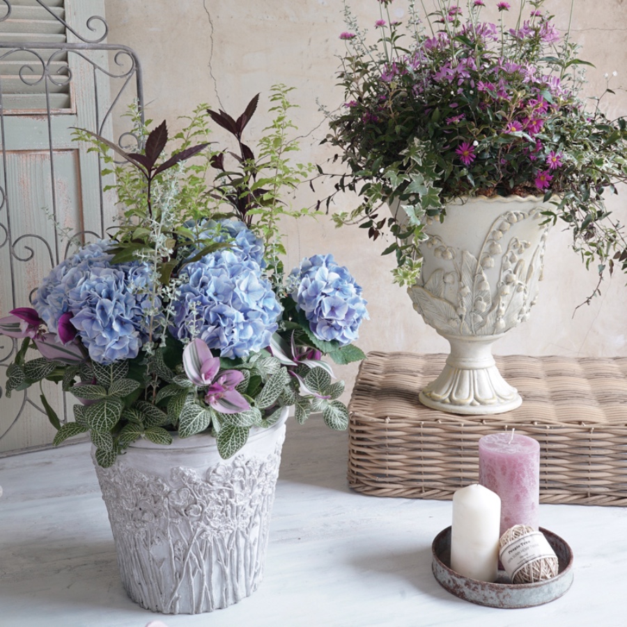 やわらかな風合いと繊細な草花模様がかわいらしいグラスファイバー鉢。