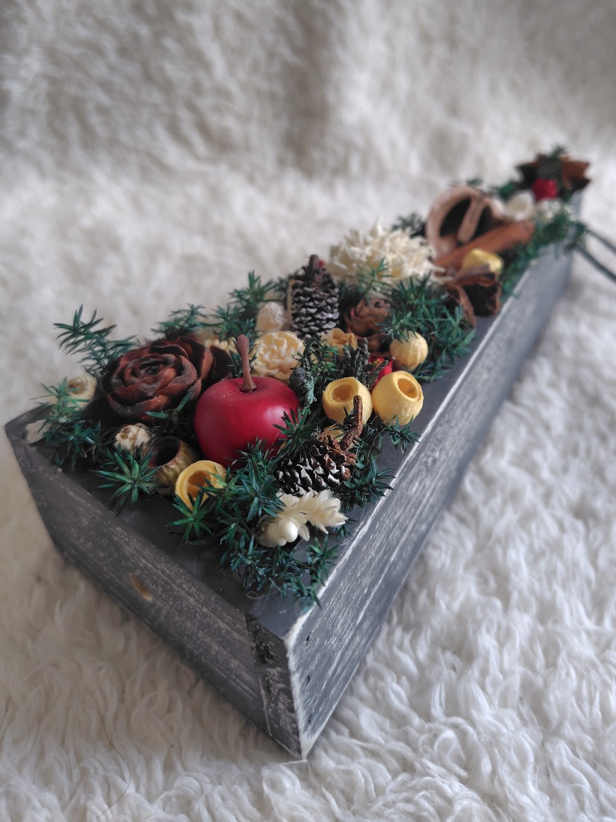 シンプルな木製の三角に、クリスマスカラーの小さなパーツを詰め込みました。
