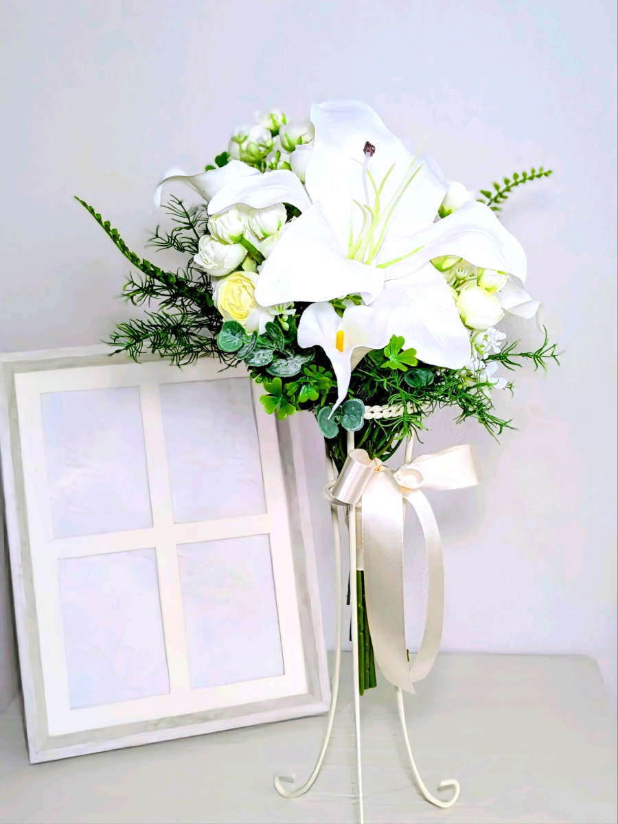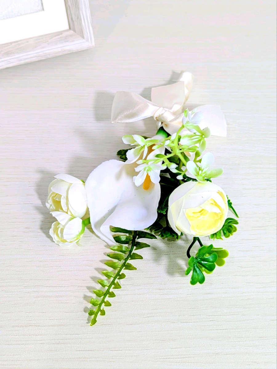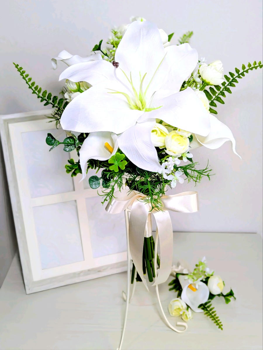 アーティフィシャルフラワーを使ったカサブランカとカラーのクラッチブーケとブートニアです。