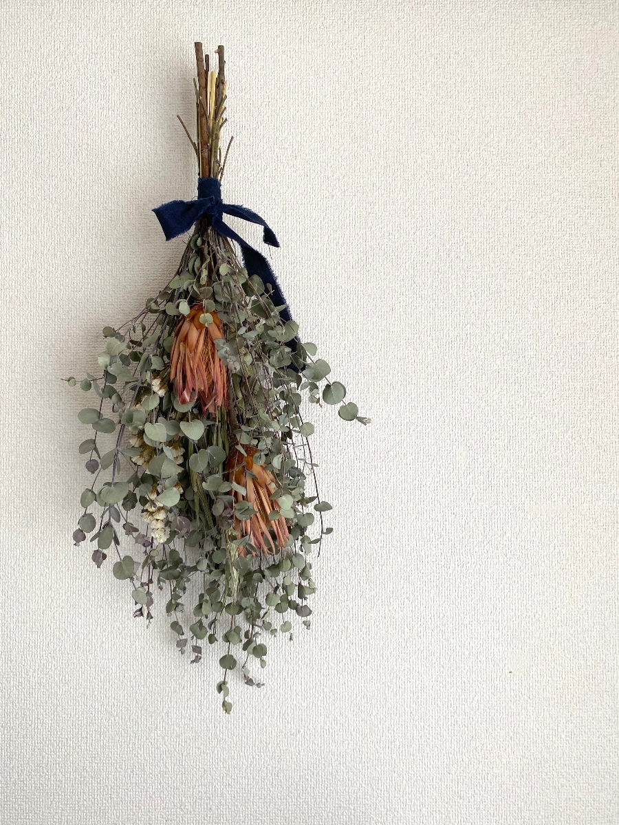プロテアとグニーユーカリのスワッグに少し涼しさを加えたくて白いスターチスと花麦をのぞかせました