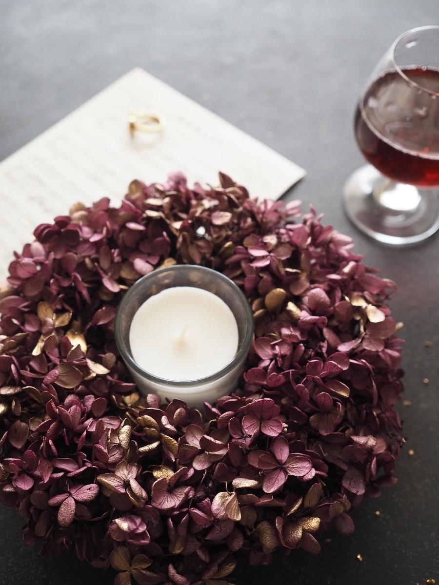 ボルドーとゴールドのプリザーブドあじさいをたっぷり使って、