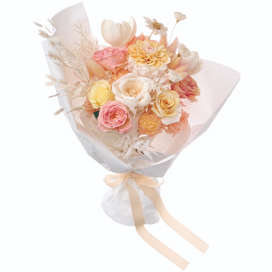ドライフラワーやソーラーフラワーを組み合わせて束ねることで更にプリザーブドフラワーが引き立つ花束が作れます。