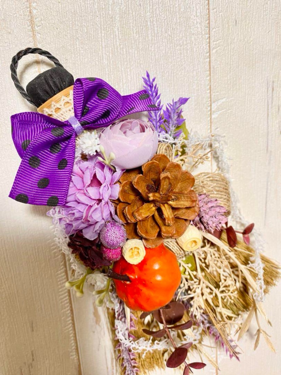 ミニほうきにハロウィンカラーのお花やドライ花材を飾ってスワッグ風に。ドットやレースリボンで大人かわいいナチュラルアレンジになりました。
