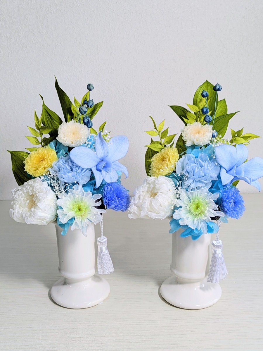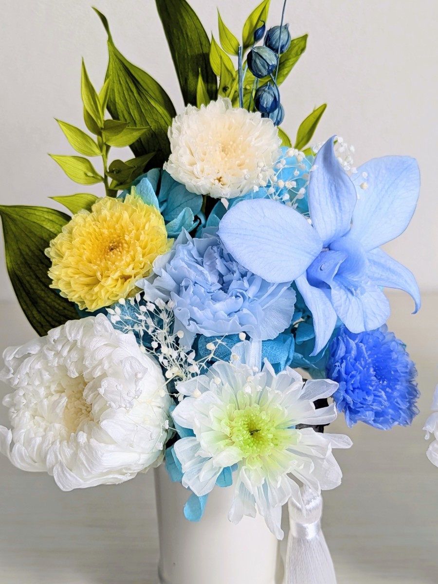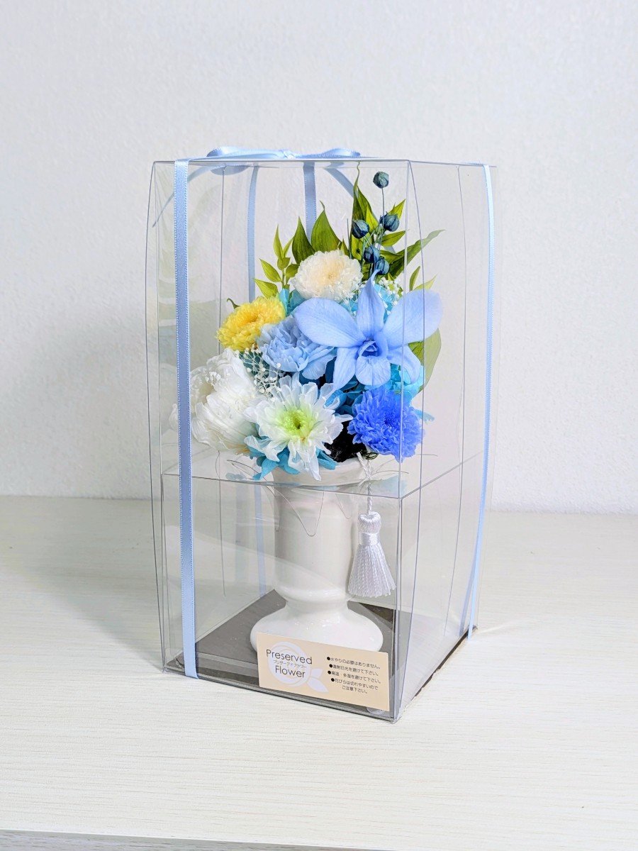 プリザーブドフラワー仏花ブルークリアケース入です。菊や蘭を沢山使った綺麗め仏花です。