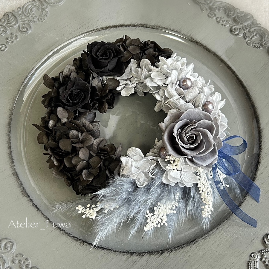 黒とグレーのバラと紫陽花を使った15cmのモノクロなミニリース。