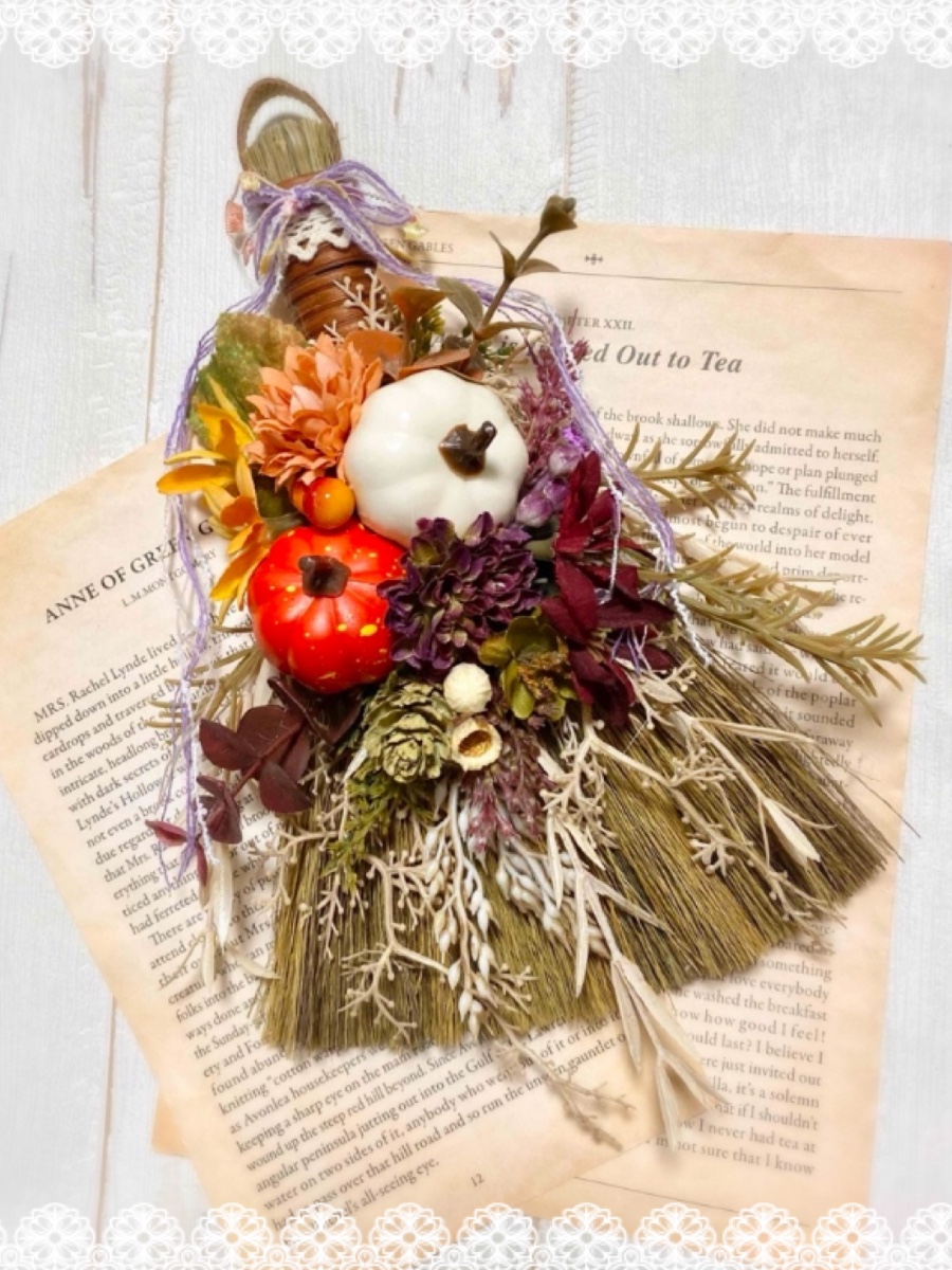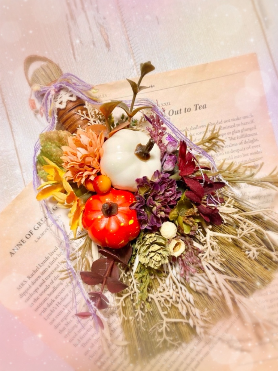 かぼちゃとハロウィンカラーの小花やドライ花材でミニほうきのスワッグ風ナチュラルアレンジです。