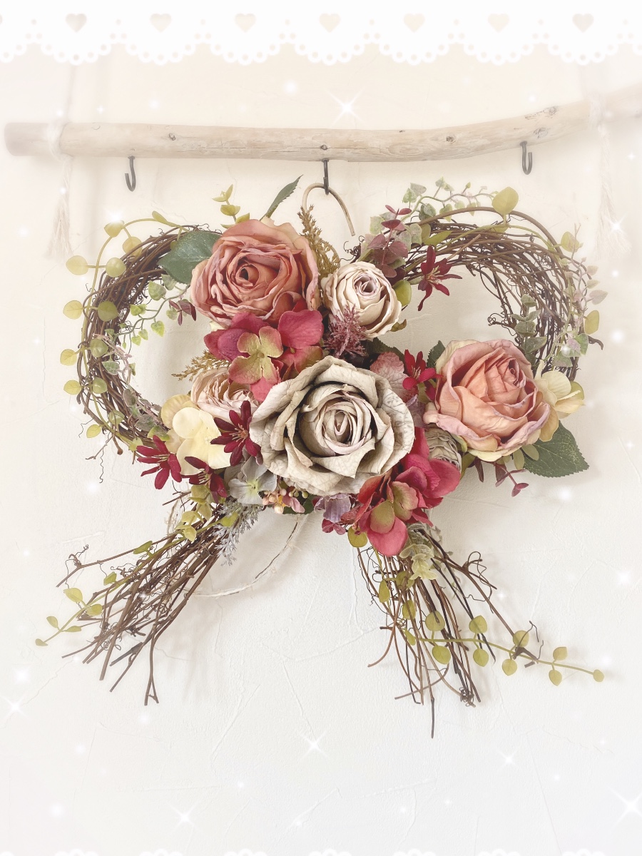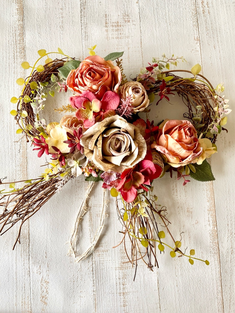 かわいいリボン型のリースにドライ風のバラと秋色花材でアンティークなナチュラルリースに仕上がりました。