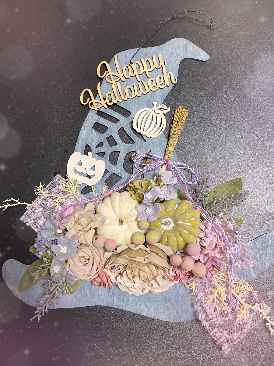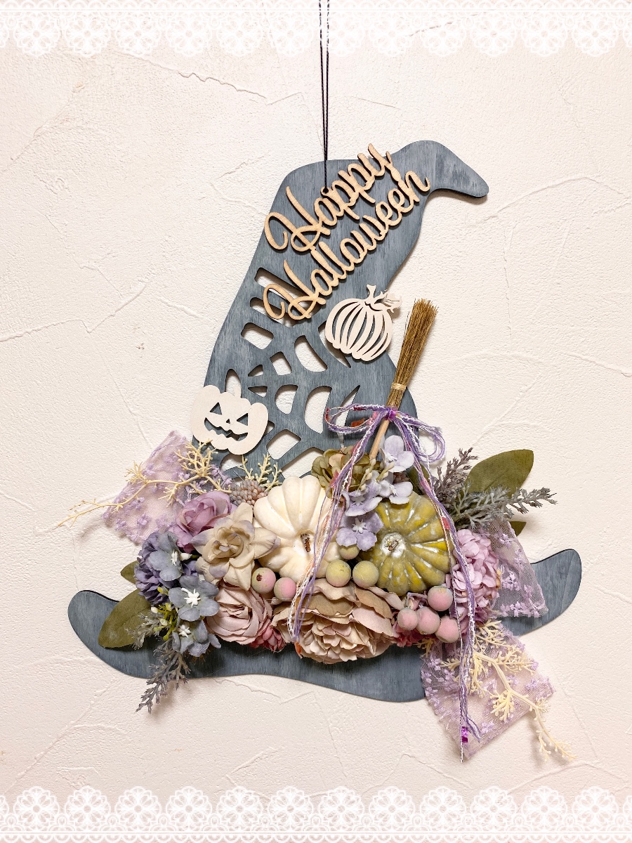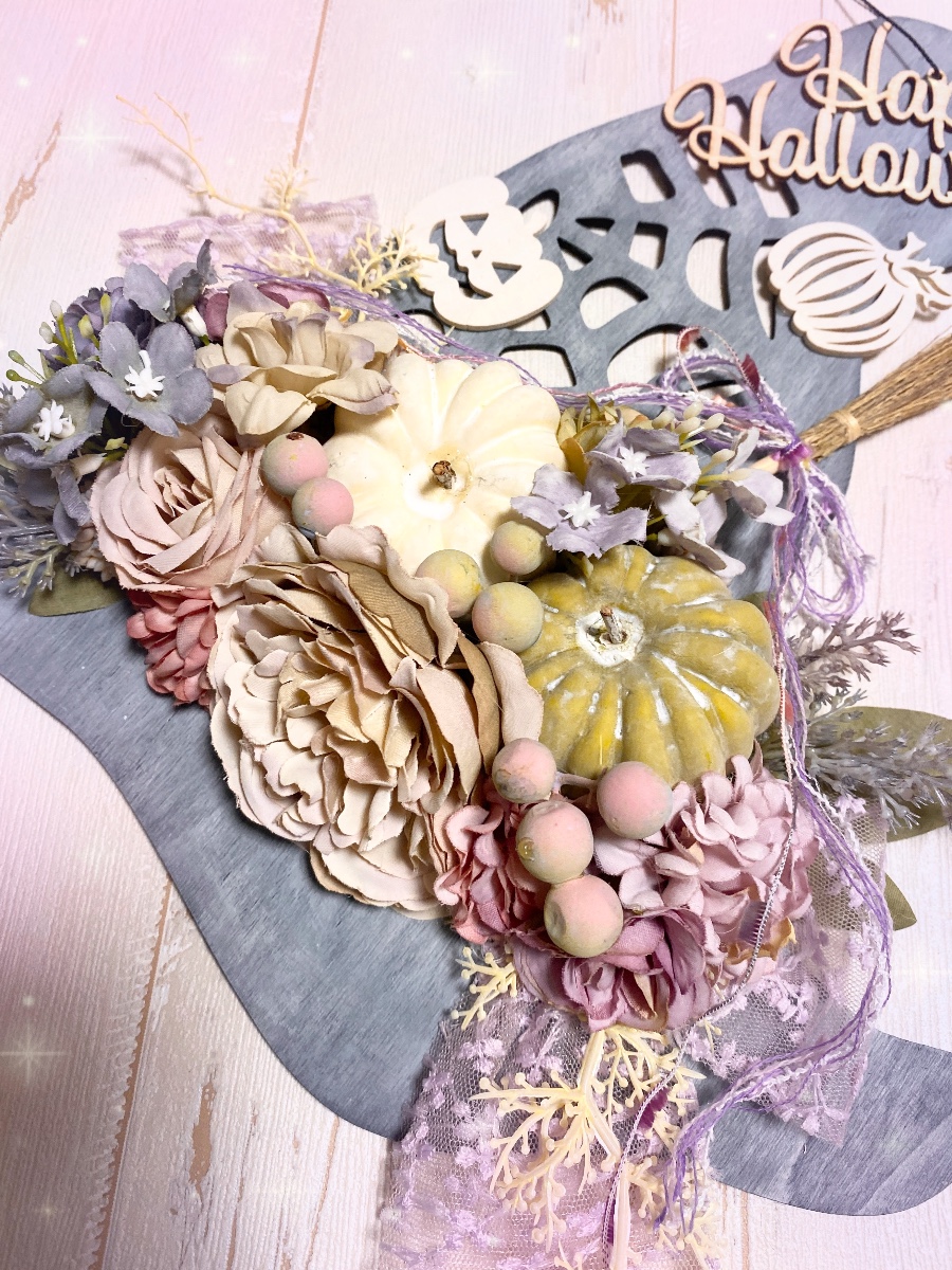 ブラックのハットプレートはペイント加工し、くすみカラーの花材とカボチャ・.ほうきなどを飾って、おとなかわいいナチュラルインテリアに仕上がりました。