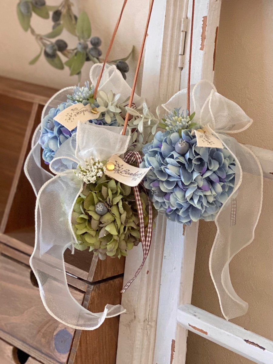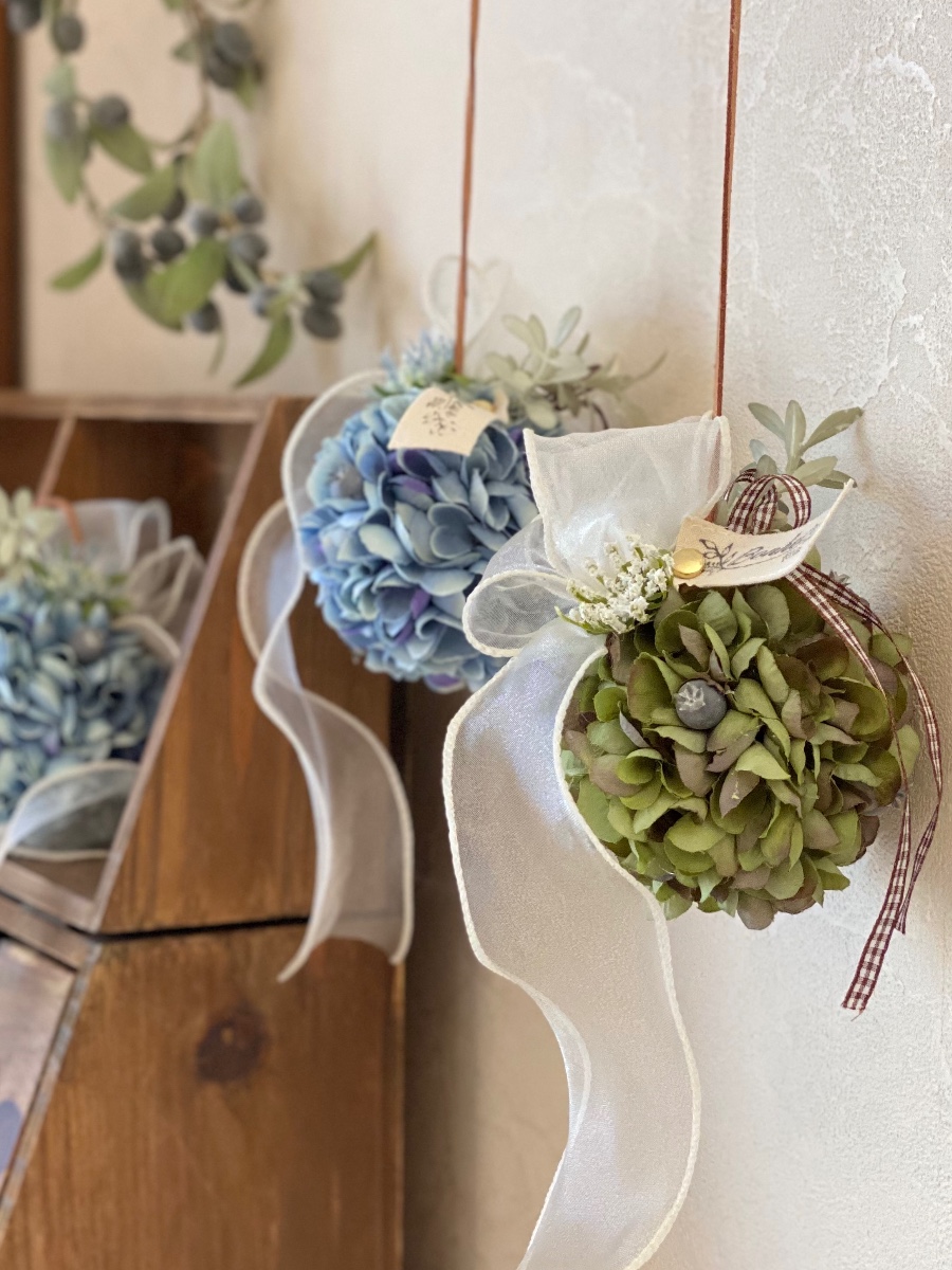 アーティフィシャルフラワーの紫陽花を使ったフラワーボールです。