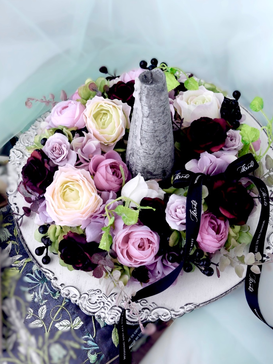 ナチャラルシックなアーティフィシャルフラワーの秋のテーブルリースです。中央にキャンドルを置いて楽しんでいただけます。