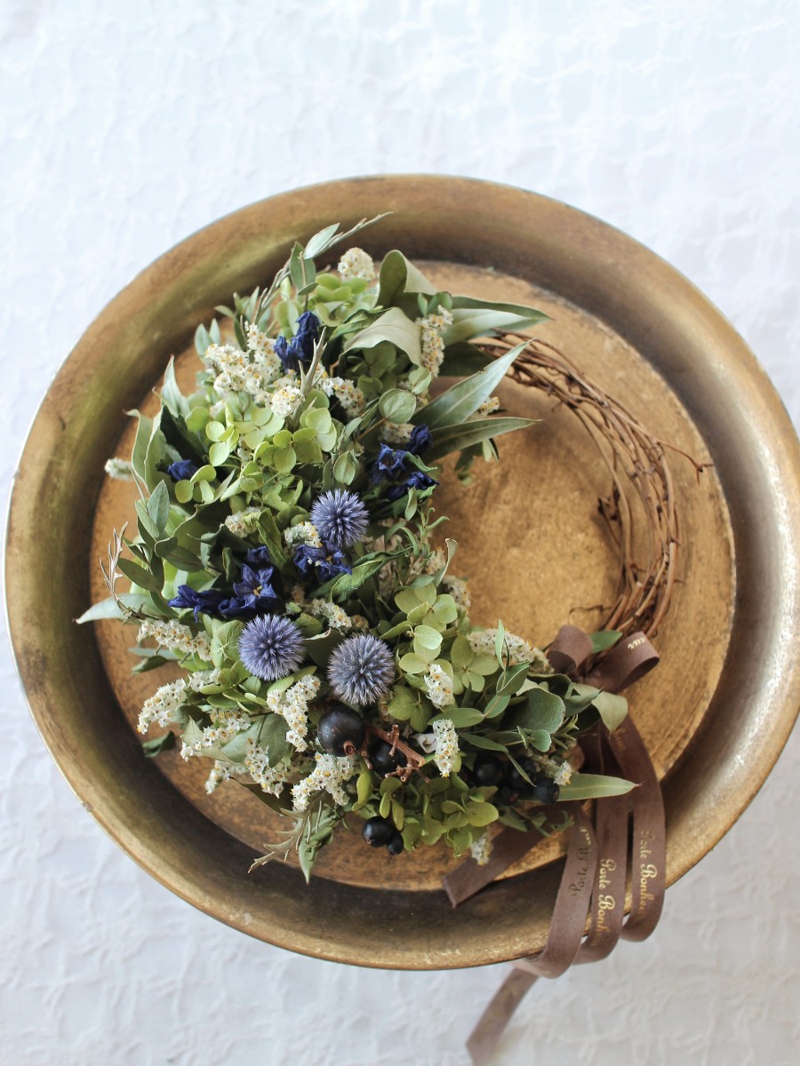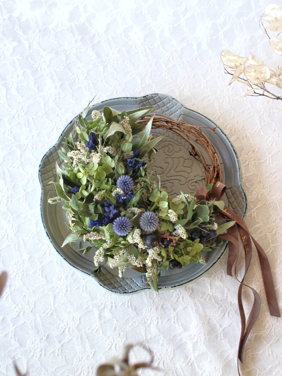 秋を感じさせてくれる竜胆とアナベルをメインに使用した、秋のブルーリースです。
