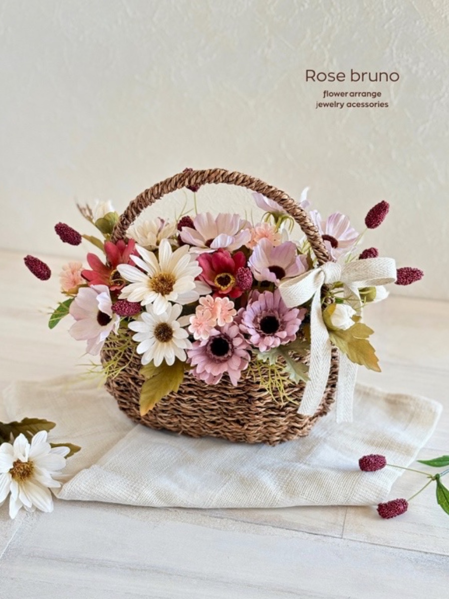 ナチュラルな雰囲気が可愛いバスケットに秋の代表花コスモス、ワレモコウなど落ち着いた雰囲気の花々を詰め込んだアレンジになります♪