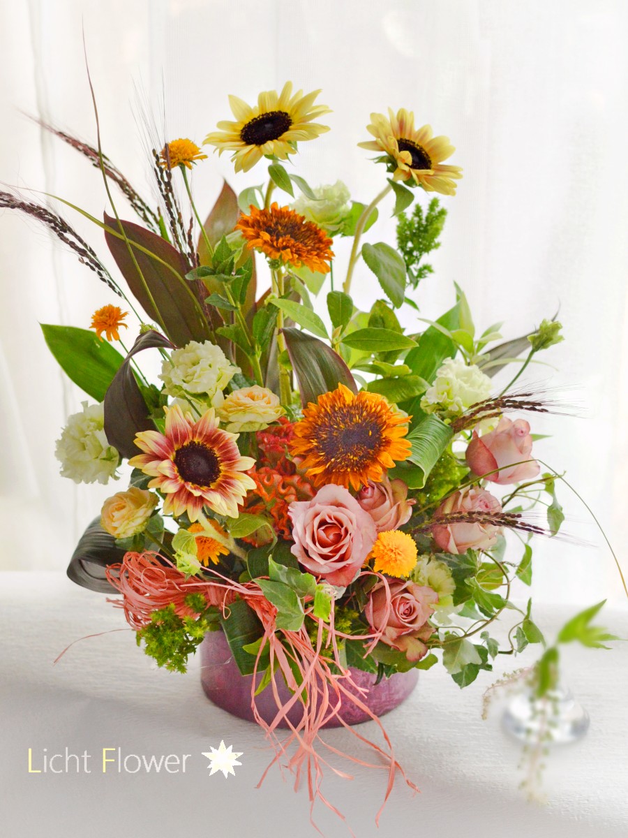 褐色した複色バラと合わせて、ほんのり秋の気配も感じられるアレンジにしました。