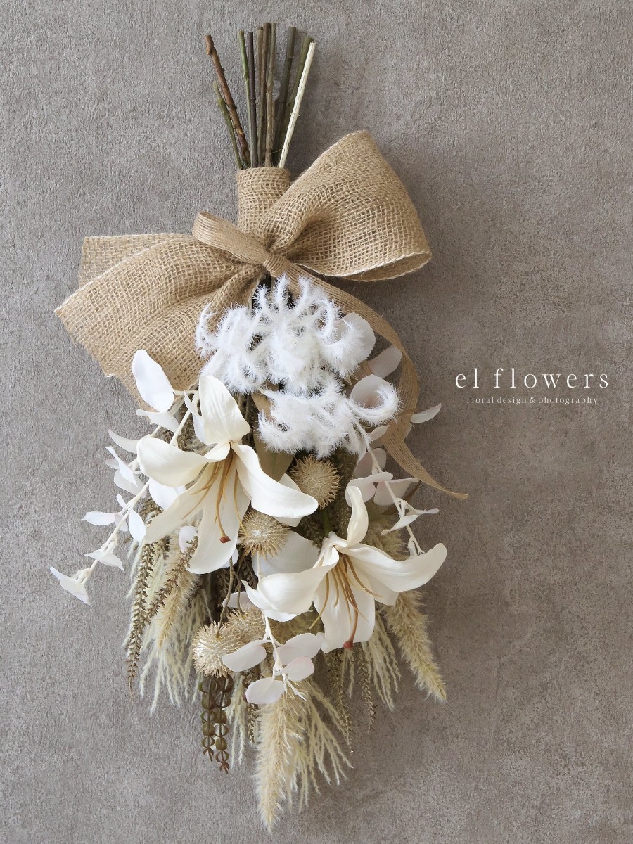 上品なホワイトからベージュトーンでまとめた、アーティフィシャルフラワー(造花)のスワッグです。