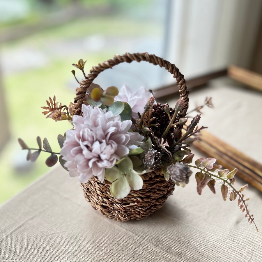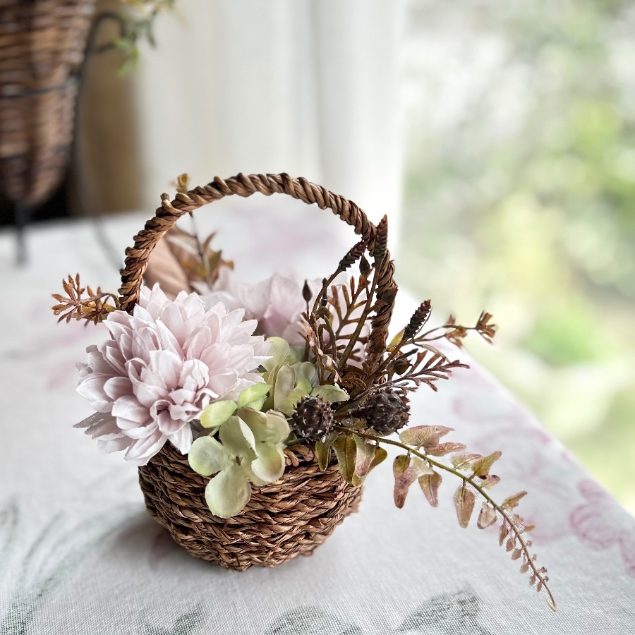 アースカラーのアーティフィシャルフラワーはドライフラワーのようです。小さなかごに合わせて秋らしいアレンジにしました。