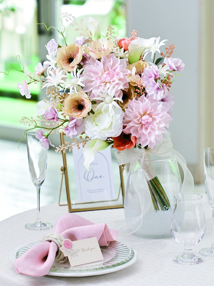 透明感のある花々で構成したゲストテーブルフラワー。