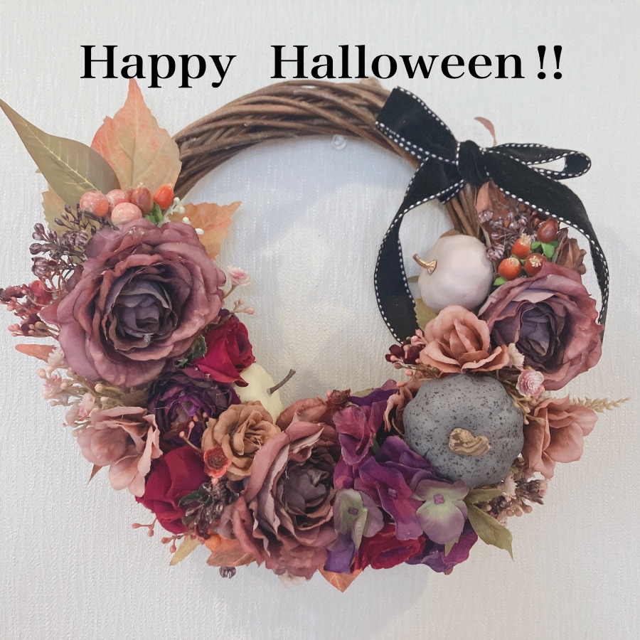 ハロウィンシーズンに向けて、オータムカラーを基調に、くすみ系の花材やパンプキンを使い、シックでアンティークな雰囲気のハロウィンリースに仕上げてみました。