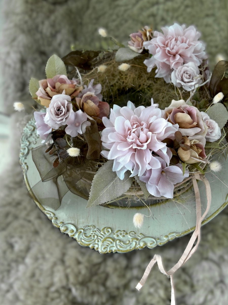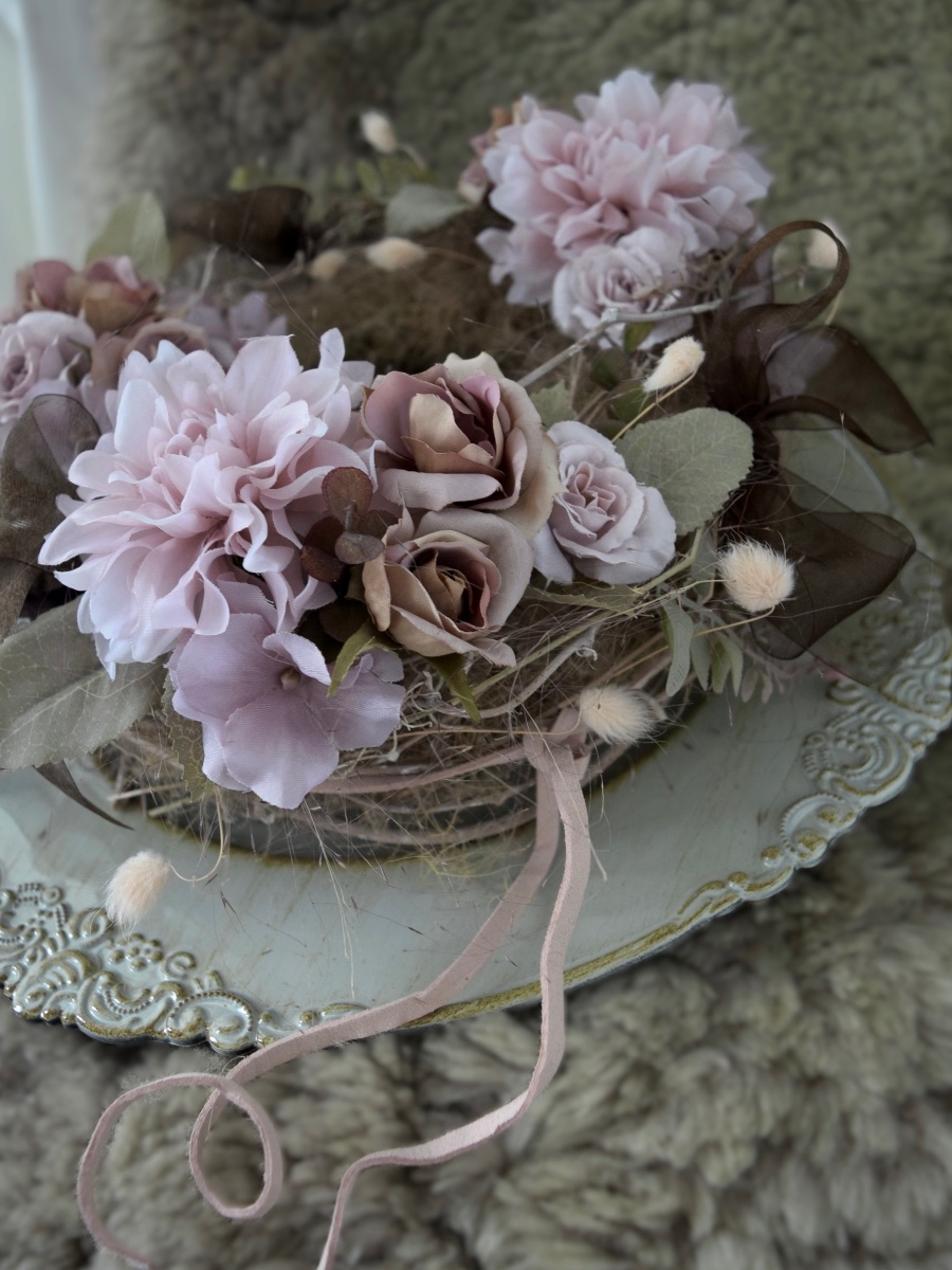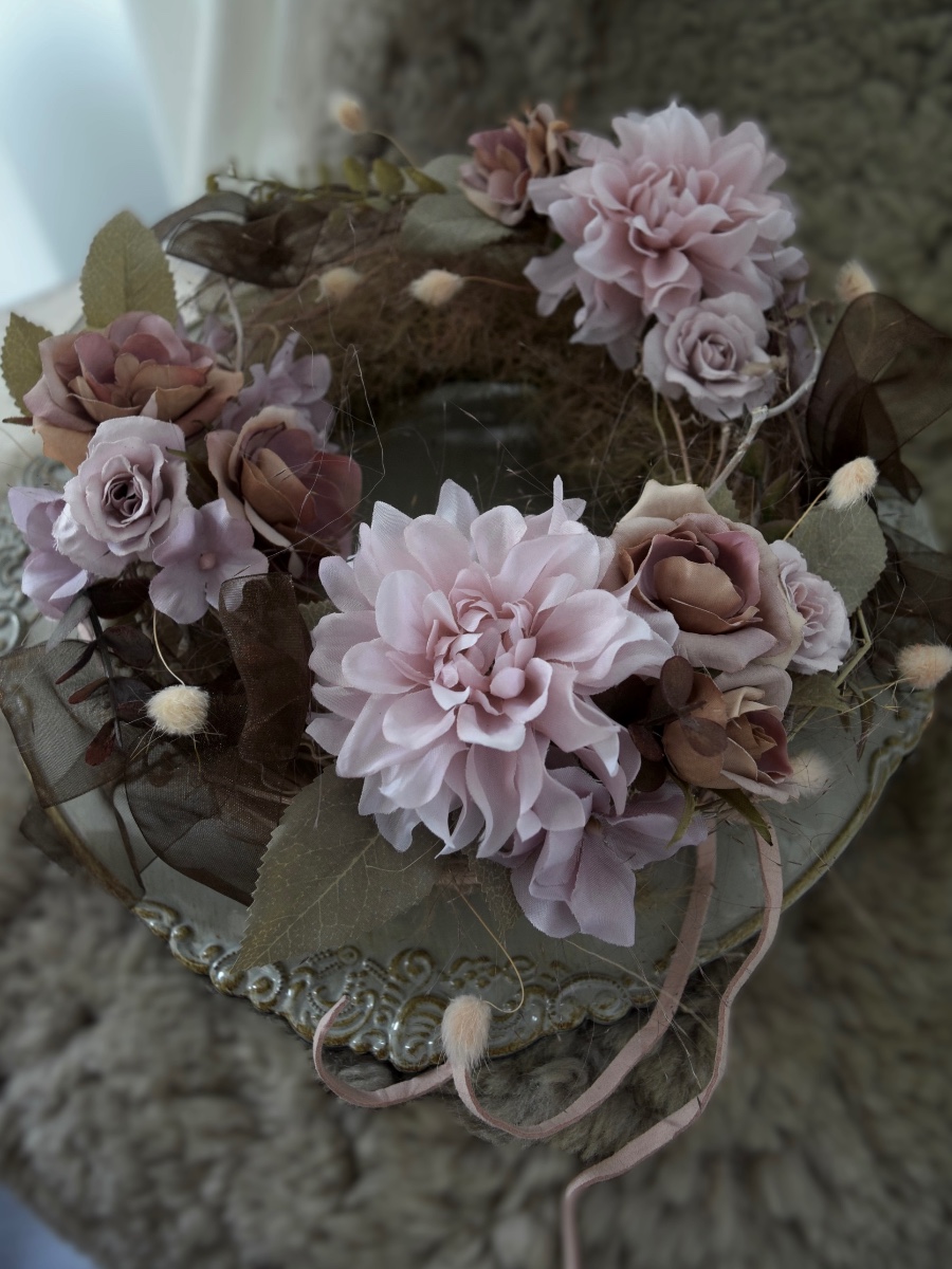 つるのリースベースにドライのスモークツリーなどを合わせふわふわ感をつけ、小さなラグラスで動きもつけたのがポイント。