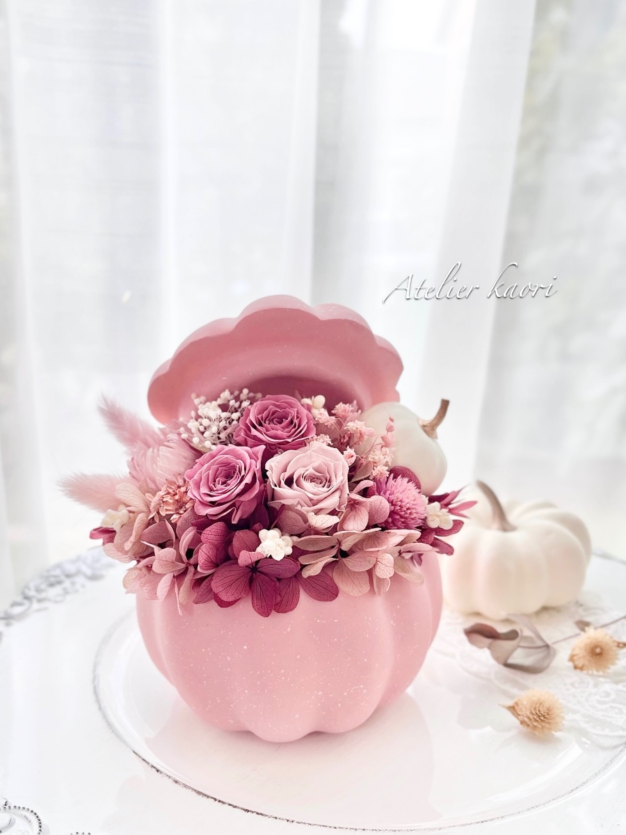 愛らしいフォルムのパンプキンポットに、秋らしいローズと小花を華やかにあしらいました。