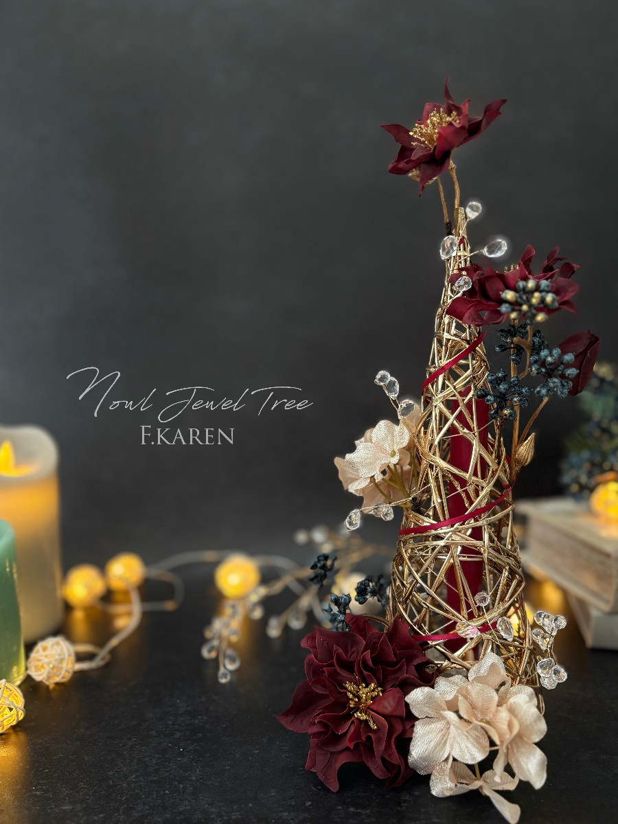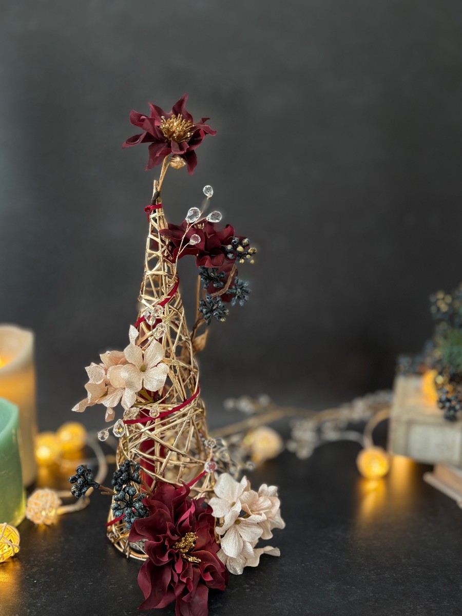 深みのあるボルドーとシャンパンゴールドのお花で彩りました。