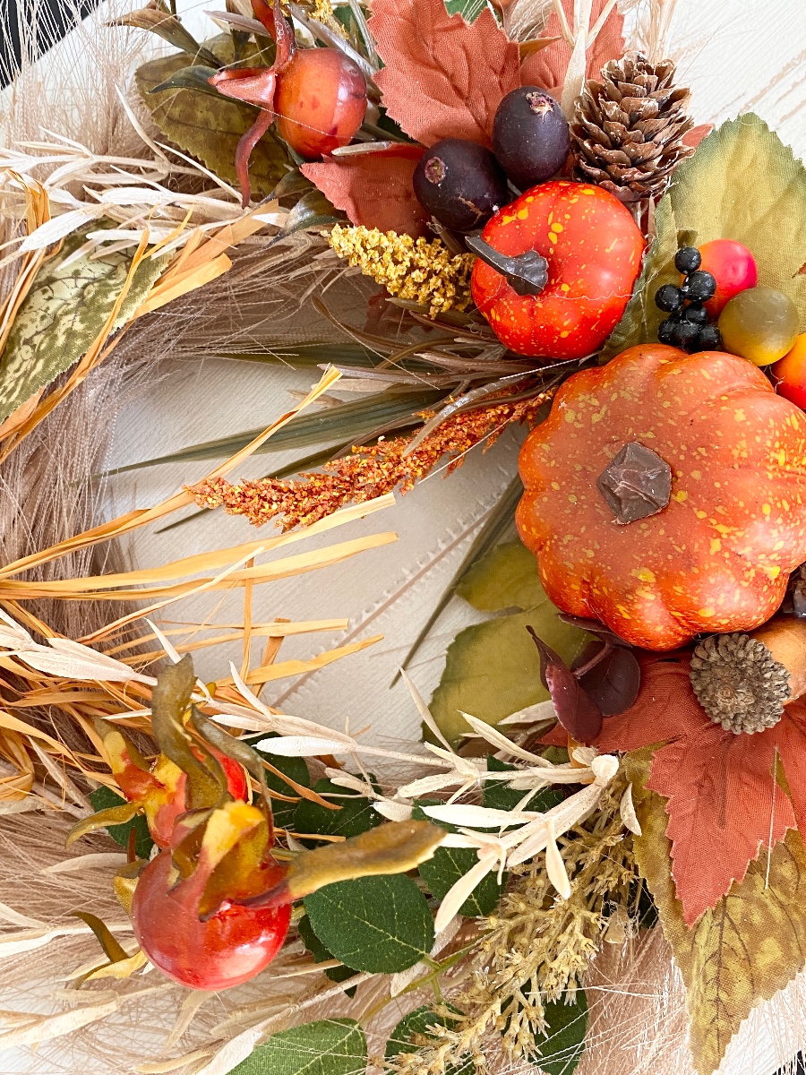 かぼちゃや木の実・ベリー、秋色リーフを使ってドライ風の秋リースに仕上げました。