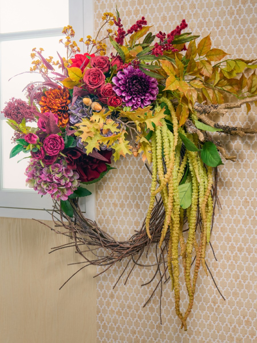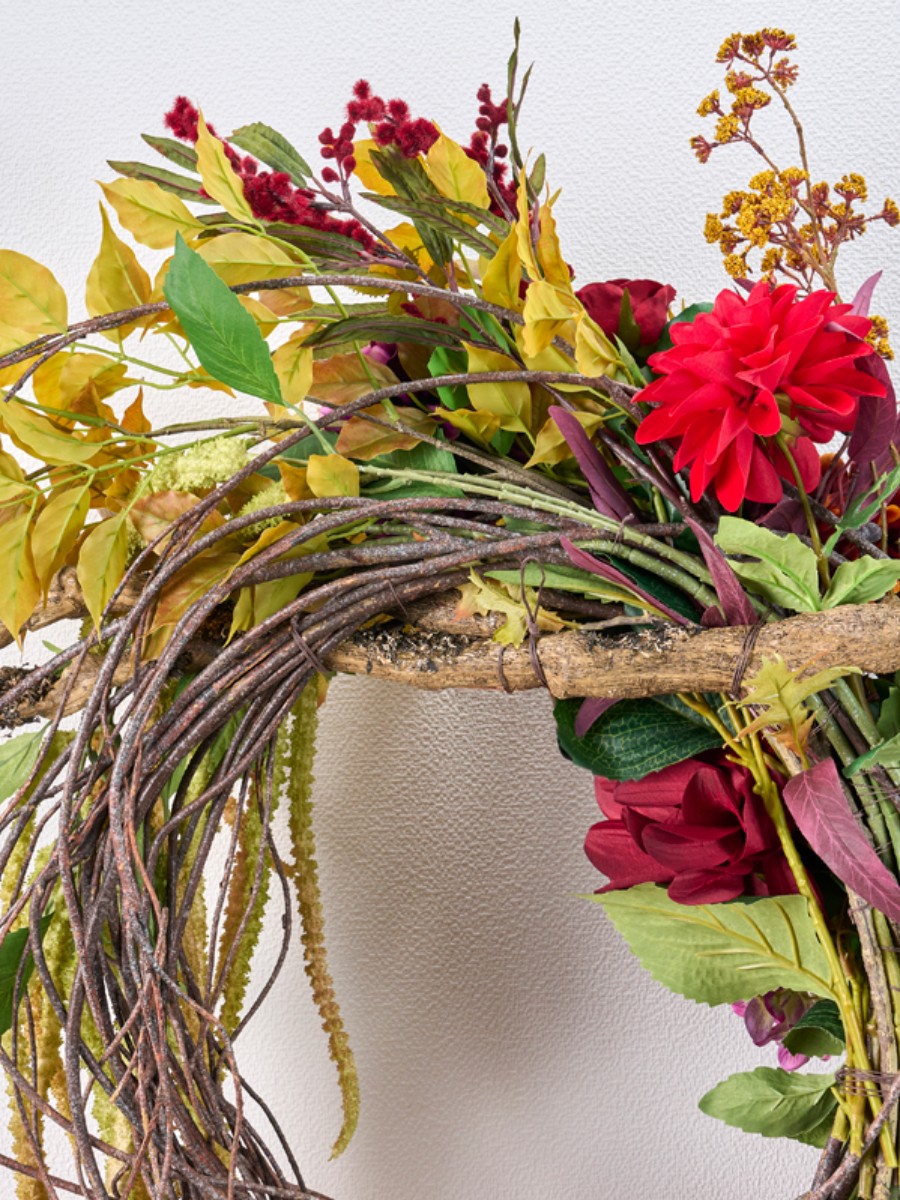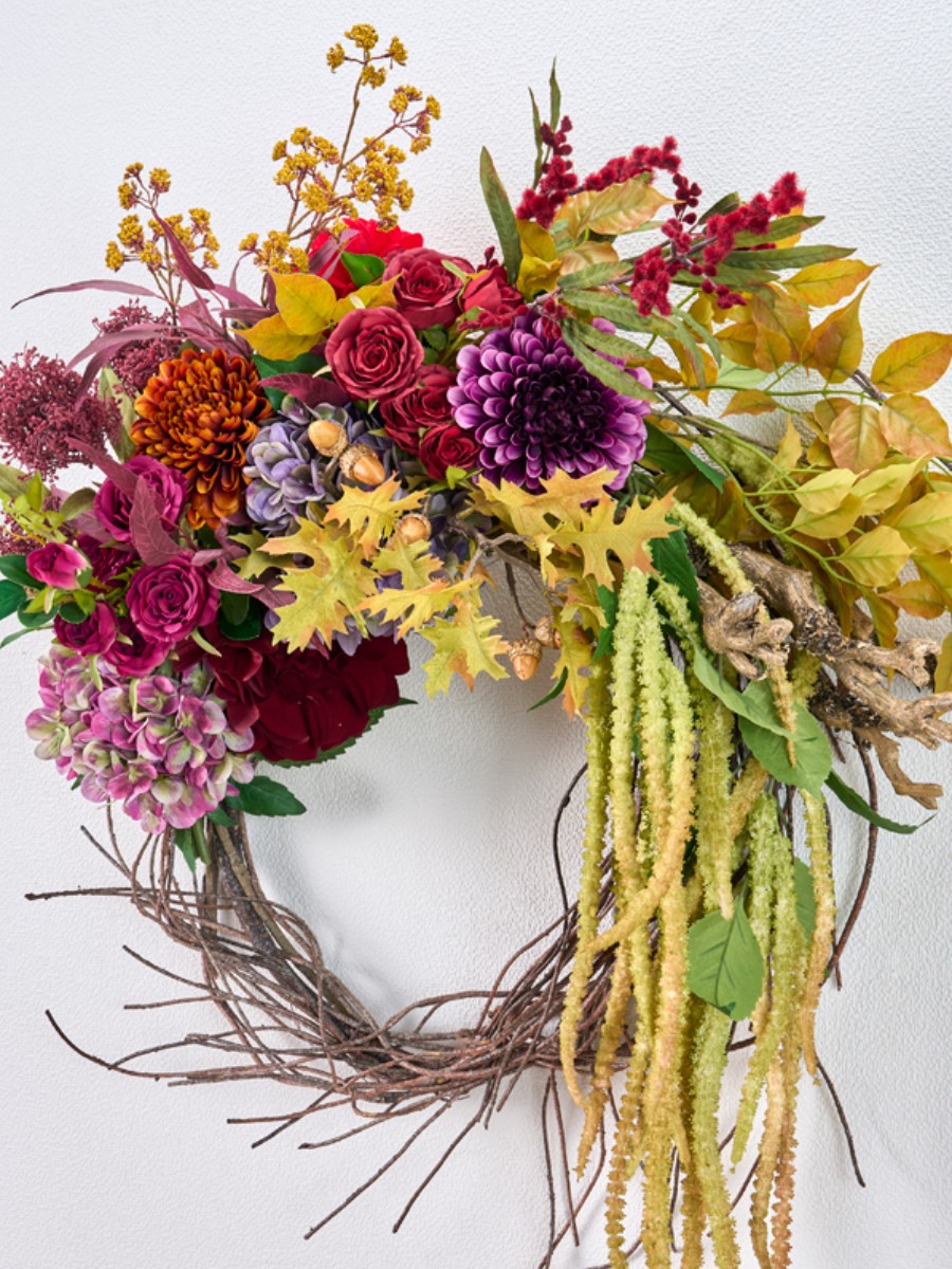 アマランサスをアクセントに、秋ならではのこっくりとした色味の花やリーフをふんだんに合わせています。