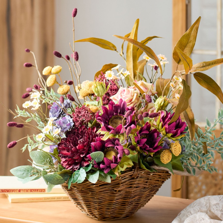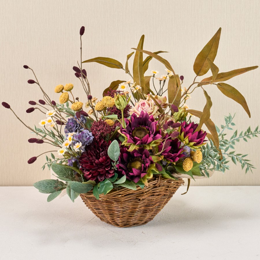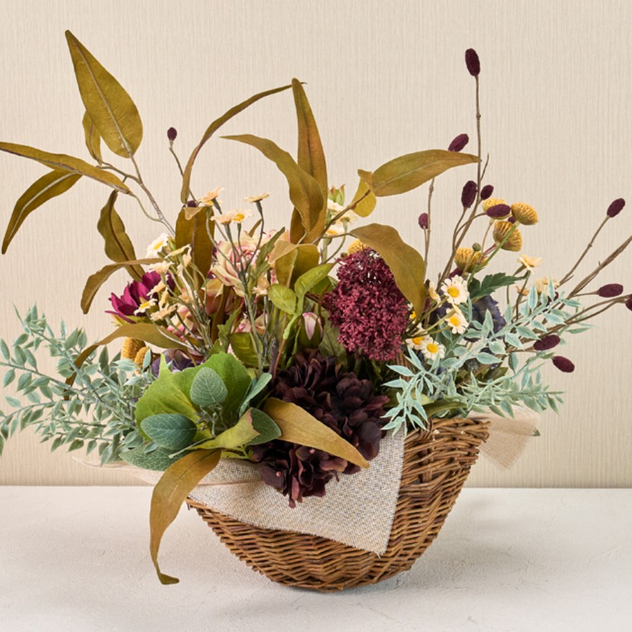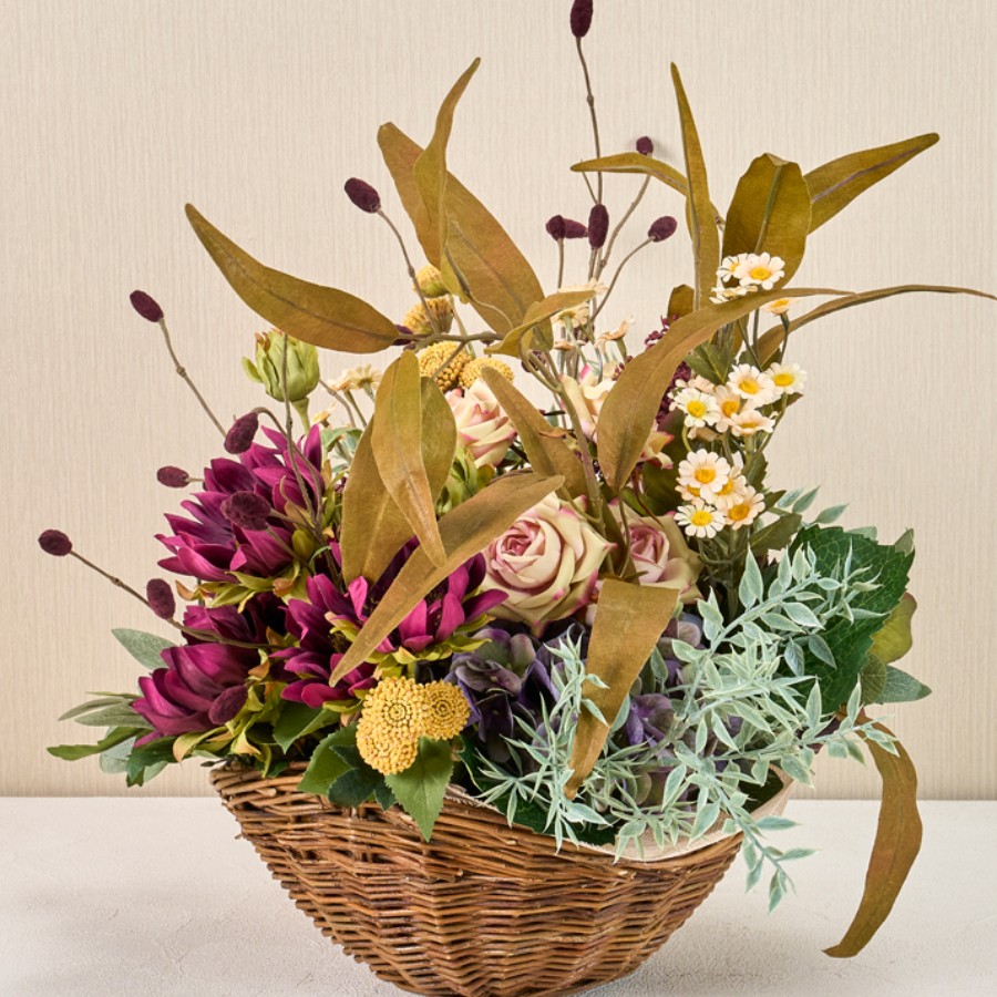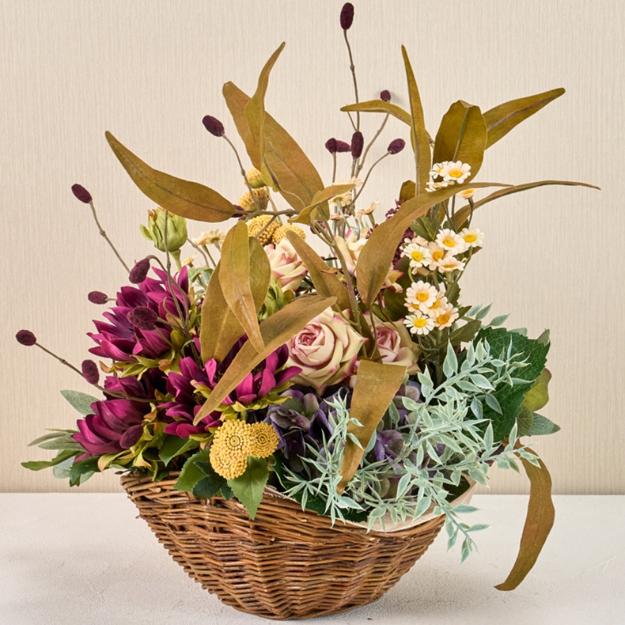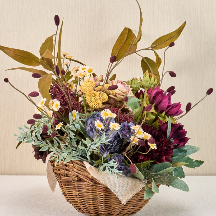 バーガンディーカラーをメインに淡いピンク・ブルー・マスタードカラーを合わせたバスケットアレンジメントです。