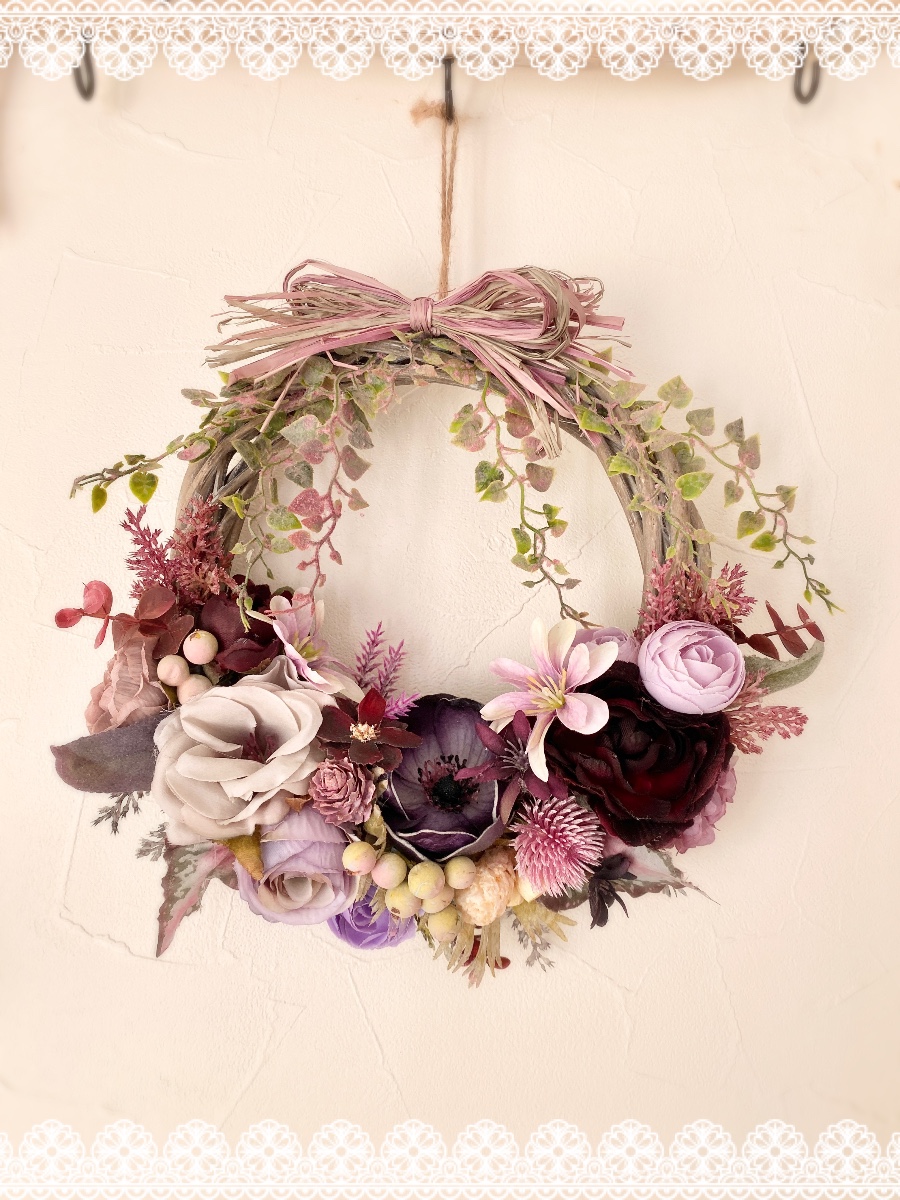 シャビーシックなリース台にパープル系のお花で落ち着いた大人かわいいハーフリースに仕上げました。