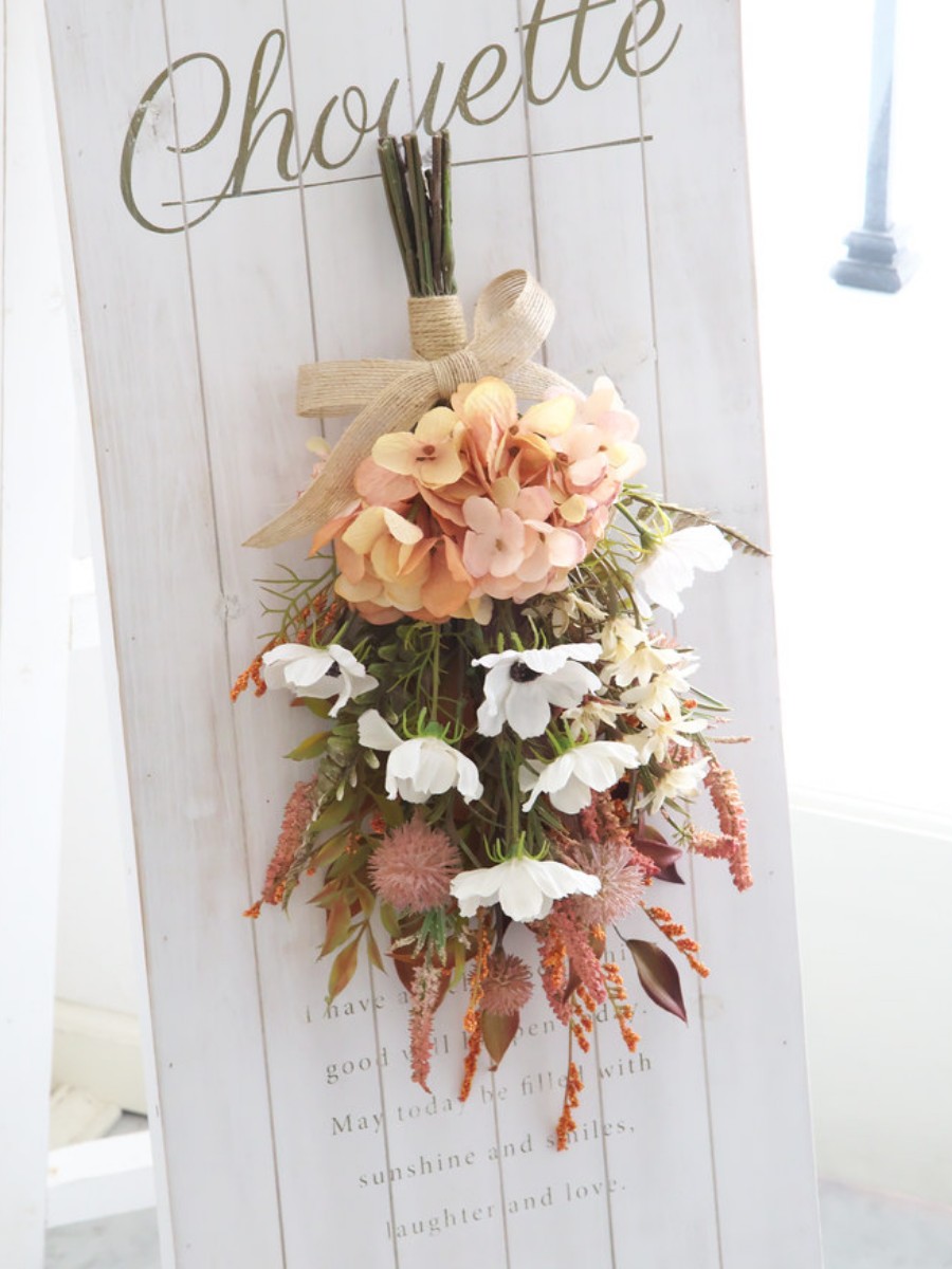 やさしく揺れる白いコスモスやデージー、淡いオレンジの紫陽花などを束ねたアーティフィシャルフラワー(造花)のスワッグです。