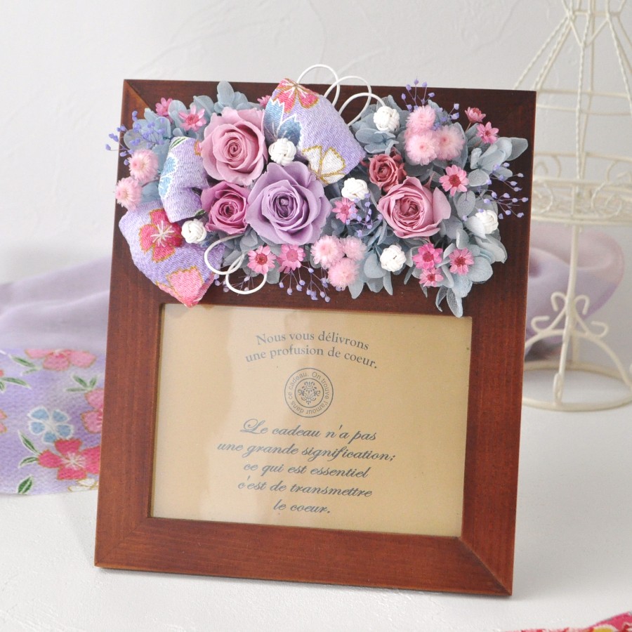 ちりめん生地のリボンがふわりとバラを包む、はんなりとしたアレンジです。