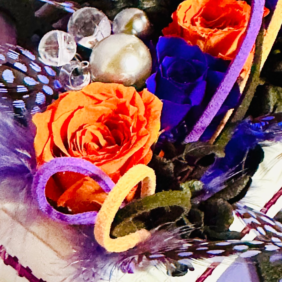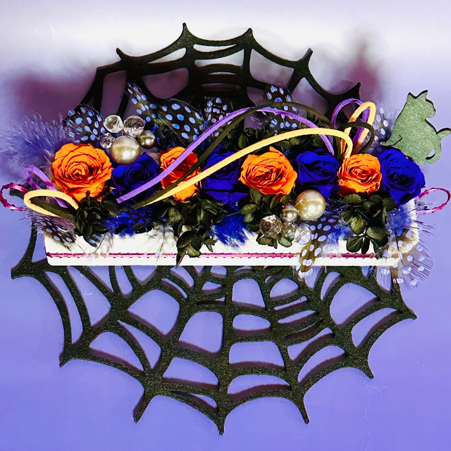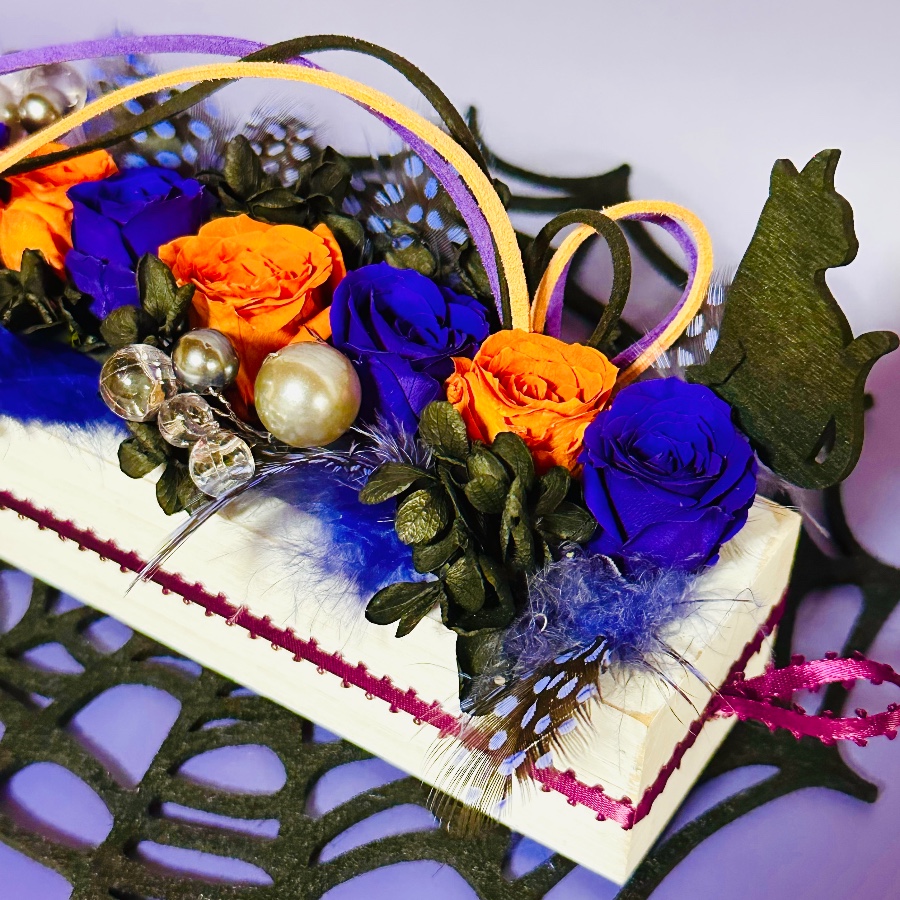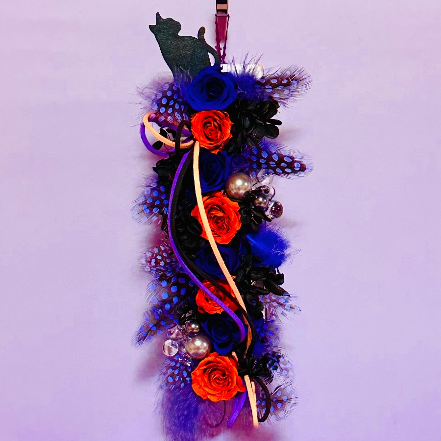 プリザーブドフラワーのローズとアジサイをメインに、ほろほろ鳥の羽を加えてハロウィンっぽくアレンジしてみました。花器にはフェザーエッジリボンでアクセント…吊り紐にもなるよう輪っかも付けたので、置き飾りとして、また吊るし飾りとしても使ってもらえます。
