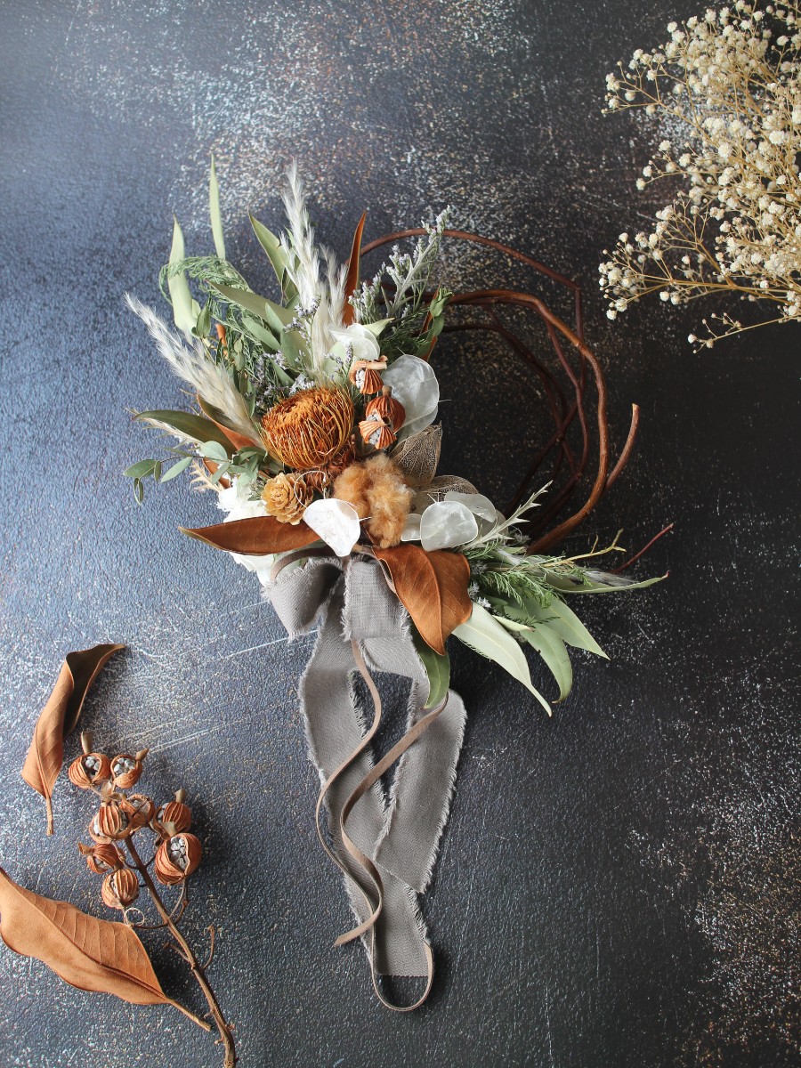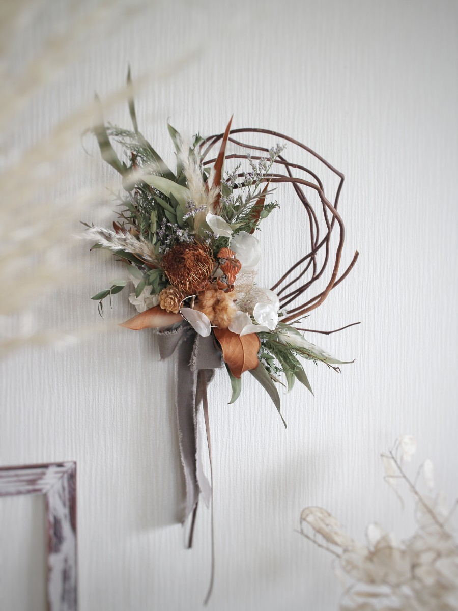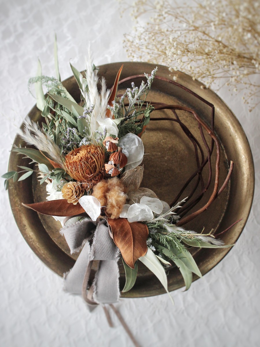 こっくりとしたブラウンカラーのドライフラワーリースです。