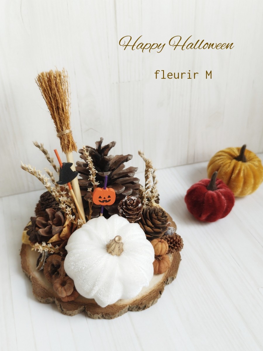 手のひらサイズの切り株に、Halloweenの森を表現しました。