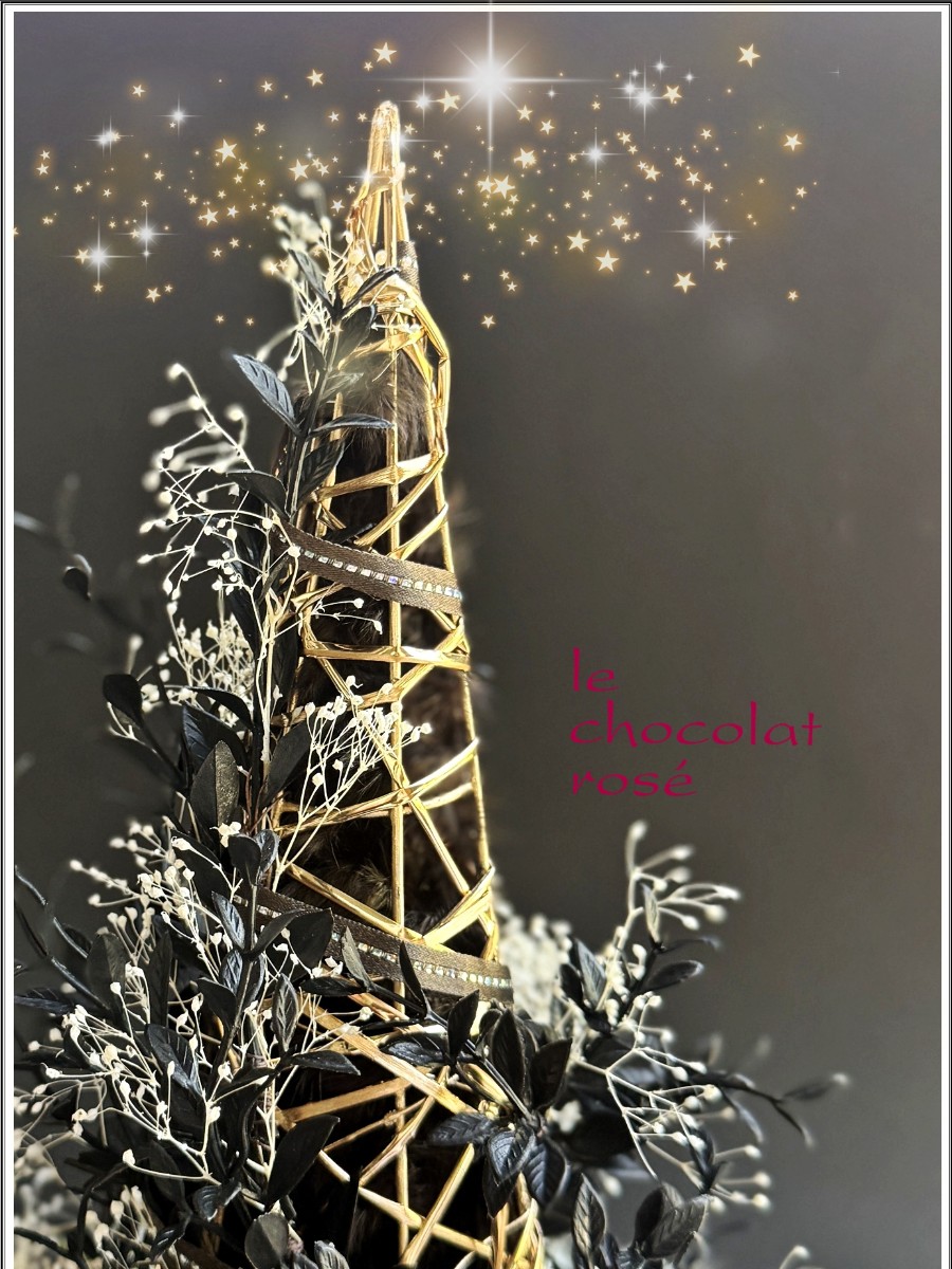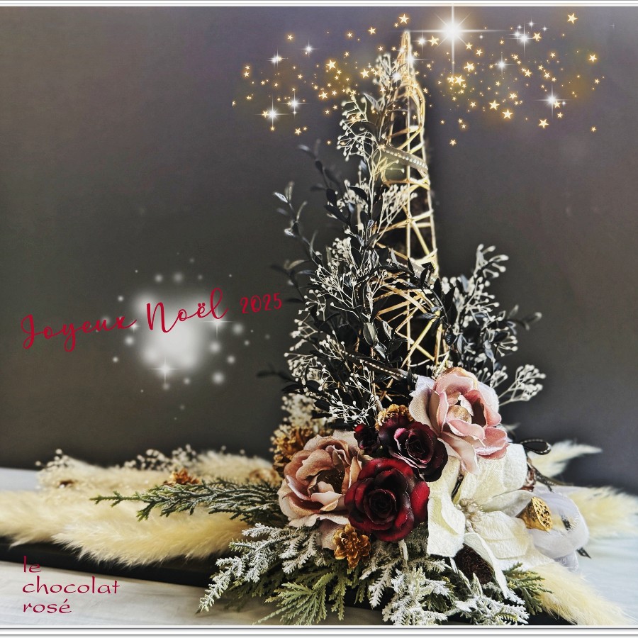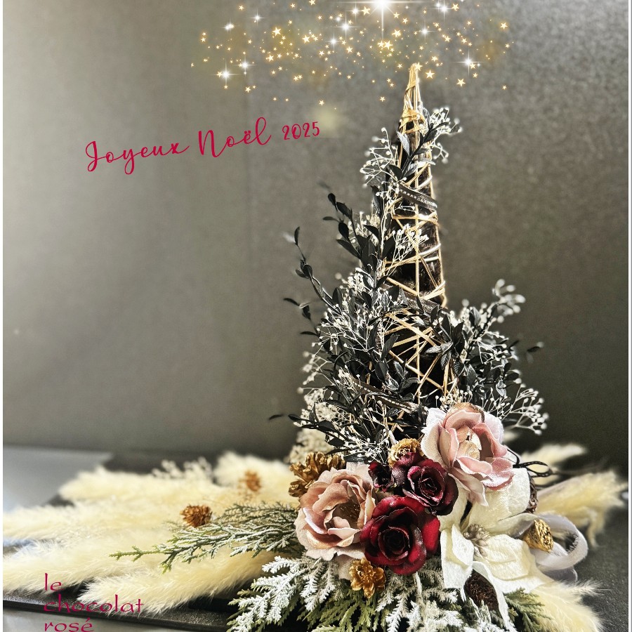 ブラックのルスカスと、ラメを纏ったかすみ草、ツリーの内側にはブラックのテールリード。