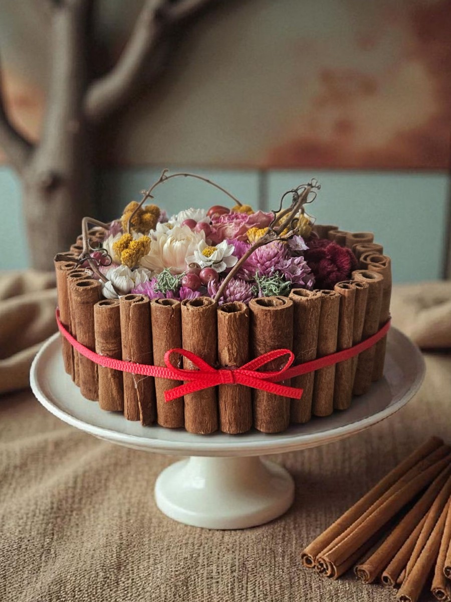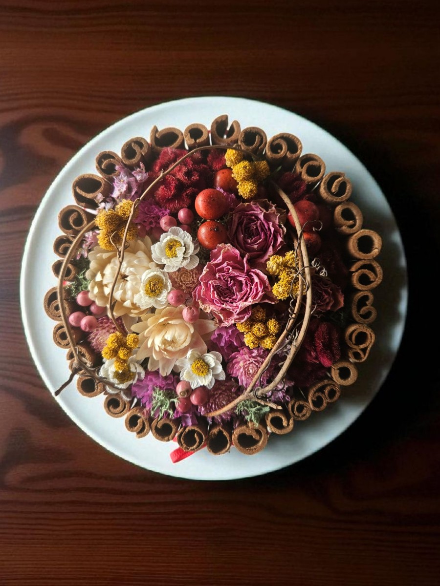 シナモンの器に色とりどりのドライフラワーを詰め込んだ、タルト型アレンジメントです。