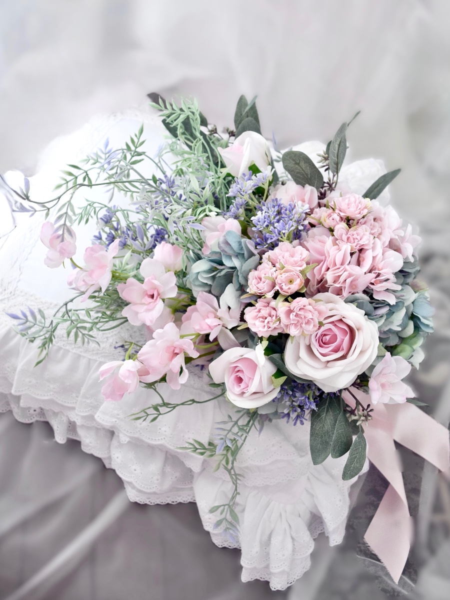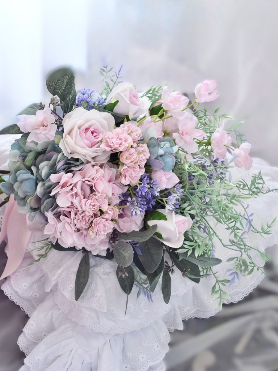 淡いピンクとブルーグレーを組み合わせたシックなクラッチブーケです。