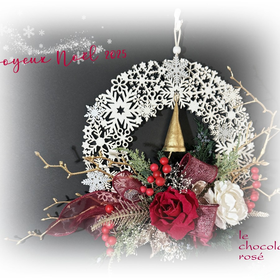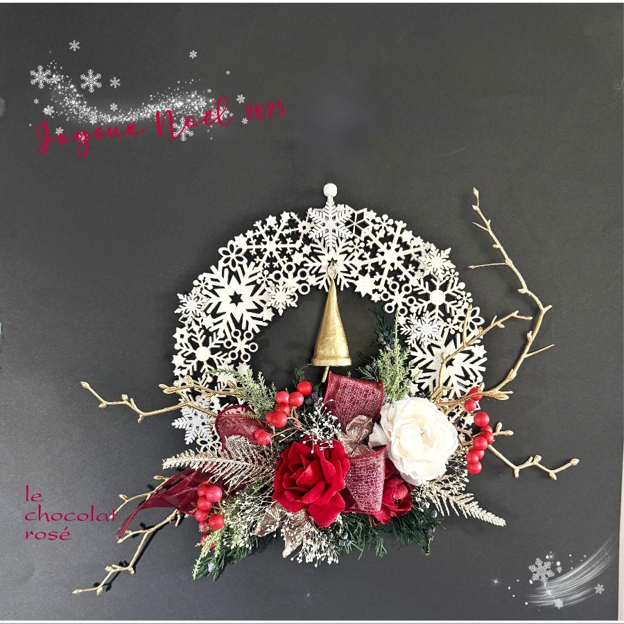 赤いサンキライの実、ラメを纏ったカスミソウなどでデコレーション。