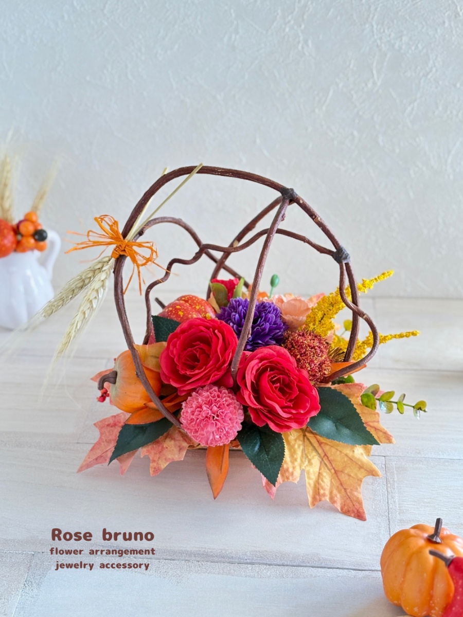 秋らしい彩りの花々、バラや可愛いポンポンマム、実りの秋 かぼちゃや麦を取り入れ、落ち着いた雰囲気のアレンジに仕上げました♡