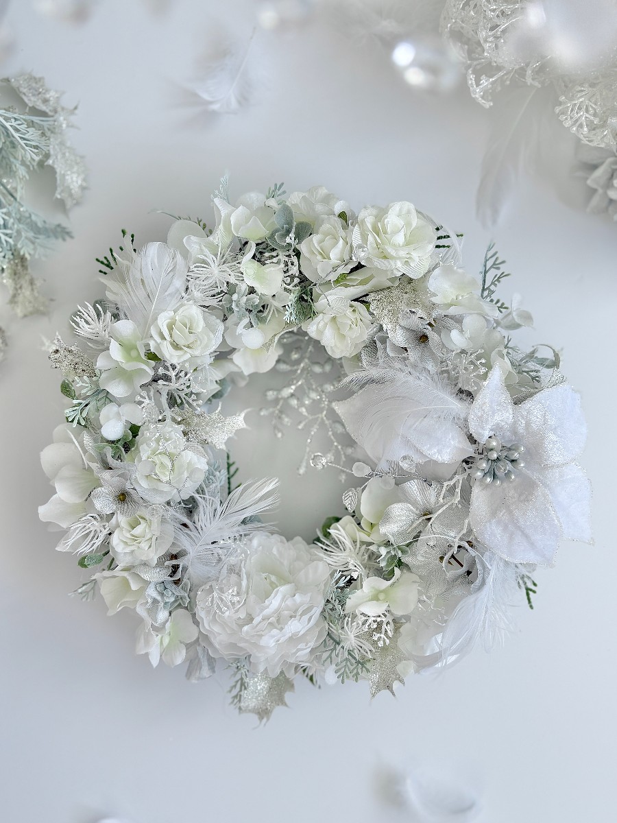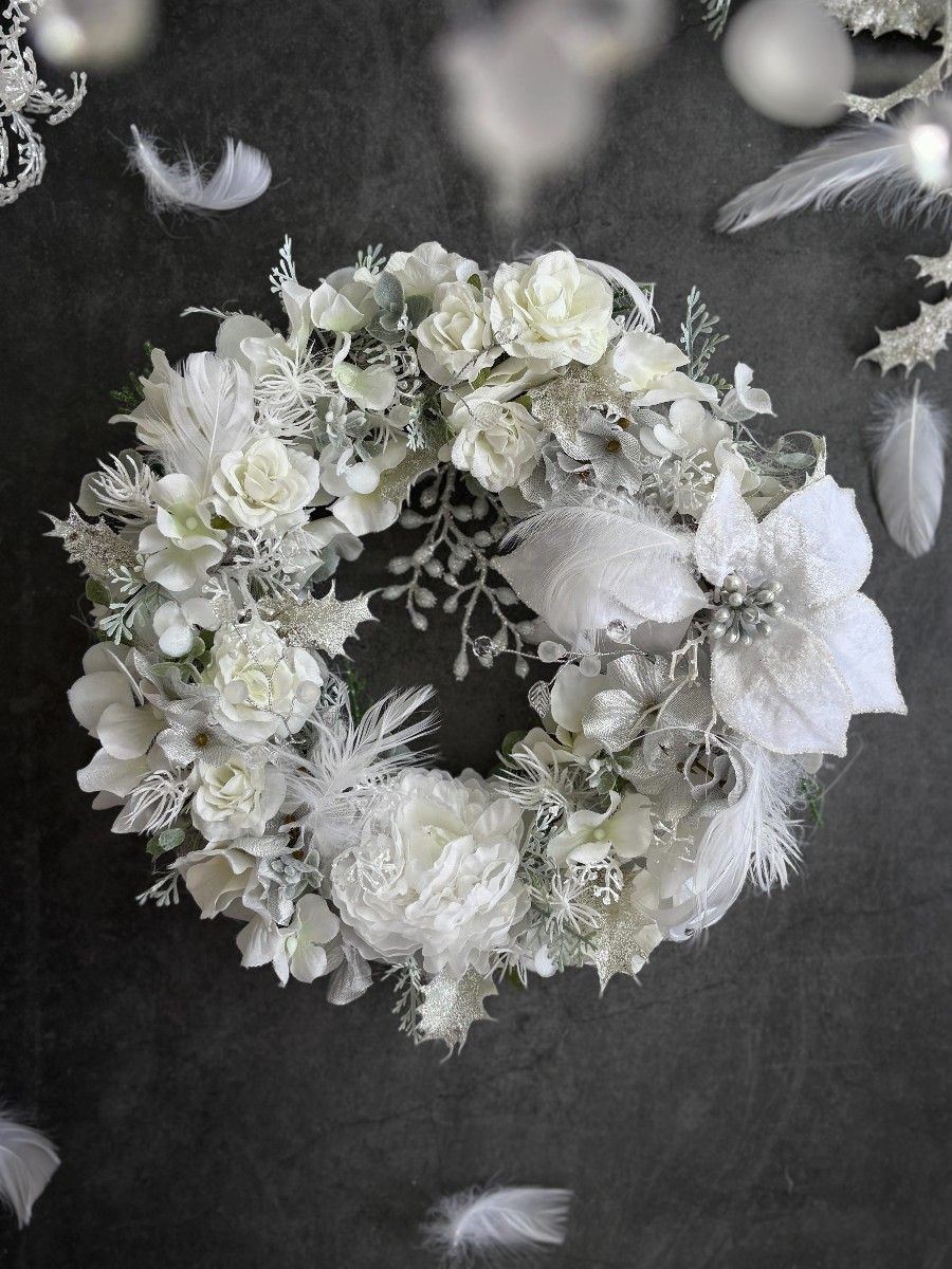 羽やジュエルをあしらったエレガントでゴージャスなクリスマスリース。