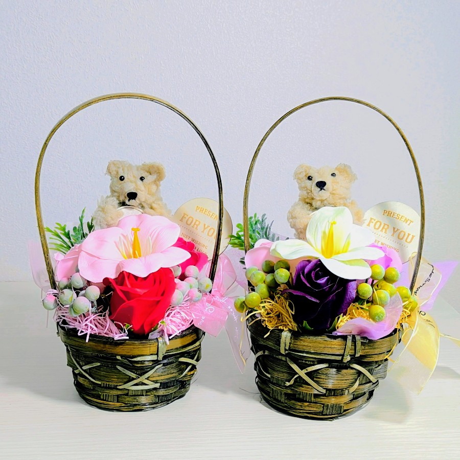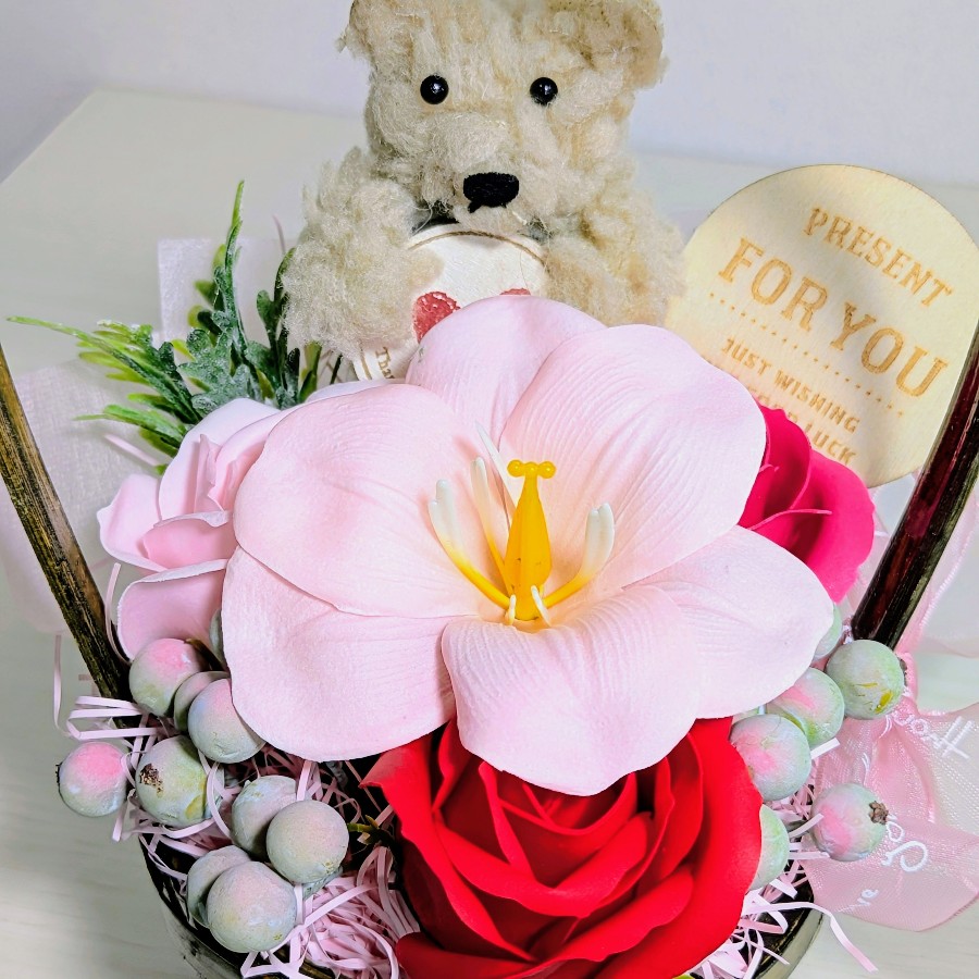 ソープフラワーで作成した小さなバスケットアレンジくまちゃんです。中央の開いたチューリップがポイントです。