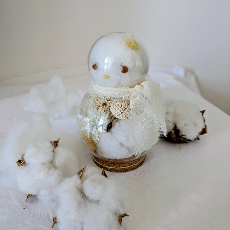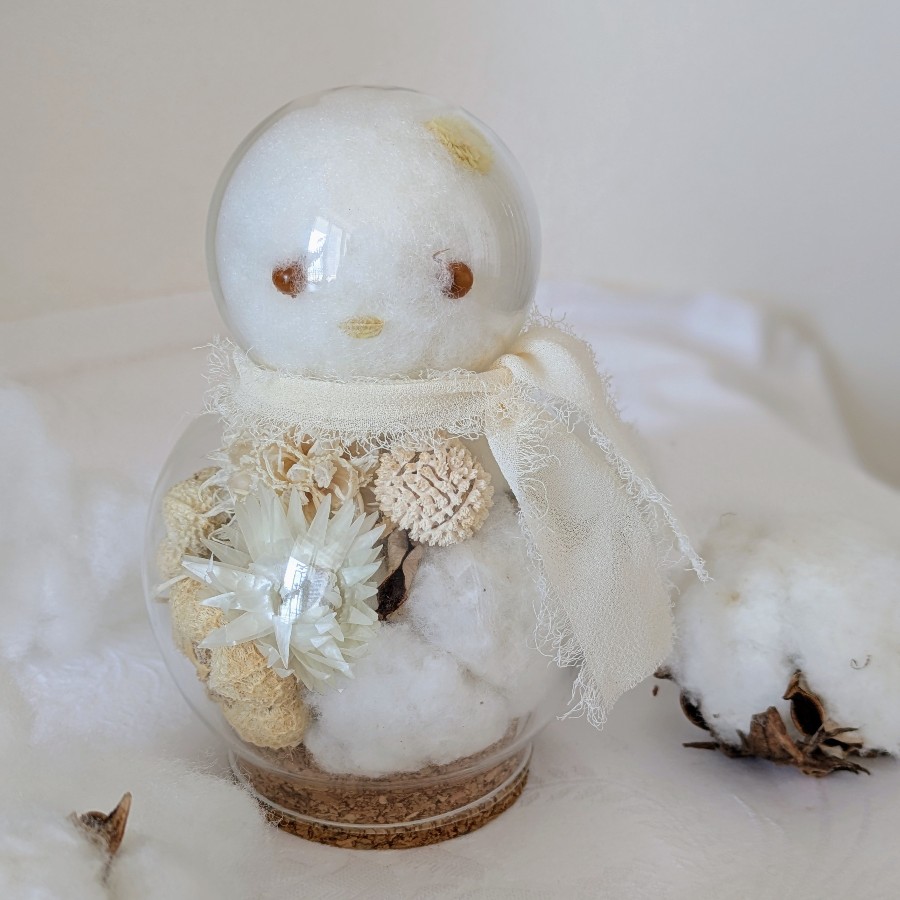 ゆきだるま形のボトルに、綿の実と白っぽい色の花と木の実を詰めた、女の子の雪だるまです。