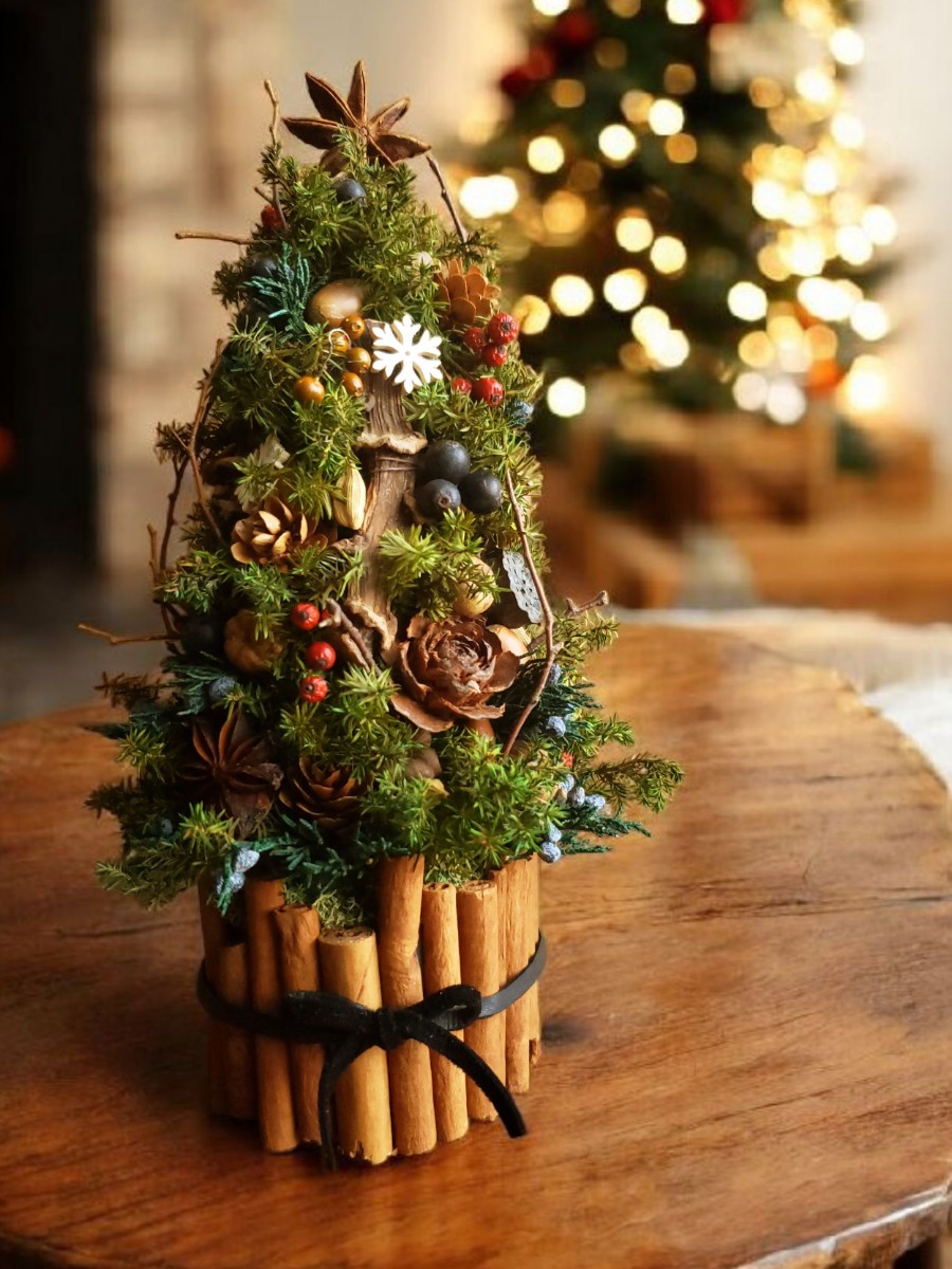 プリザーブドグリーンと実ものがあたたかな雰囲気のテーブルツリーです。