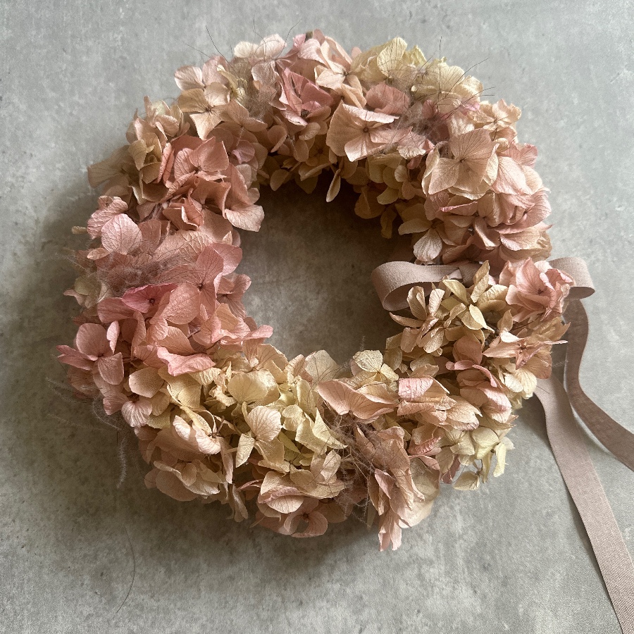 プリザーブドフラワーの紫陽花でリースを制作し、所々にスモークツリーを散りばめました。