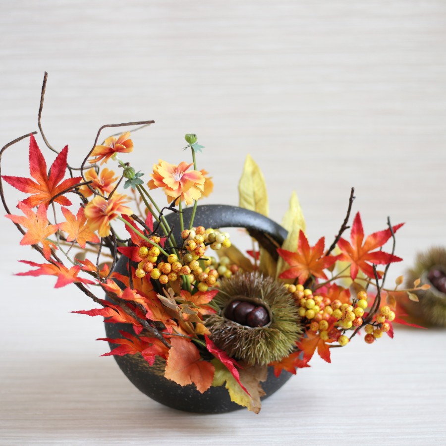 和風の円形花器に紅葉したモミジとイガ栗、山ぶどうなど秋の実りをあしらった庭園風アレンジメントです。