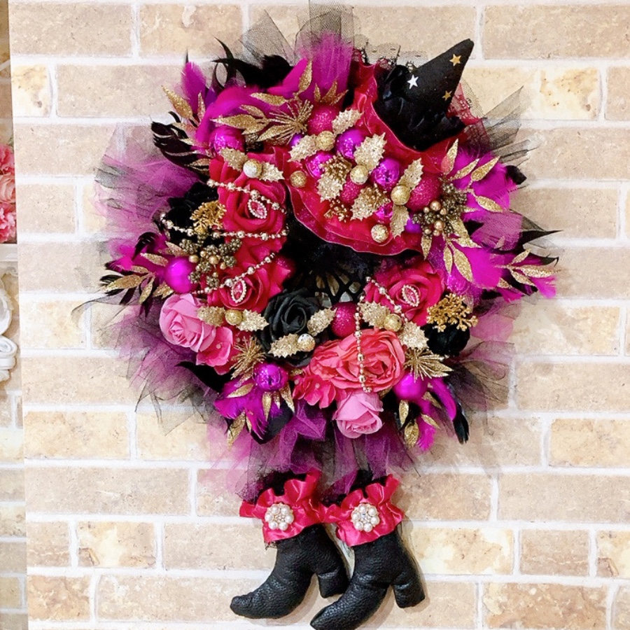 沢山のフリルやローズ、魔女の靴に帽子を使って可愛いくて豪華なハロウィンリースに仕上げました。