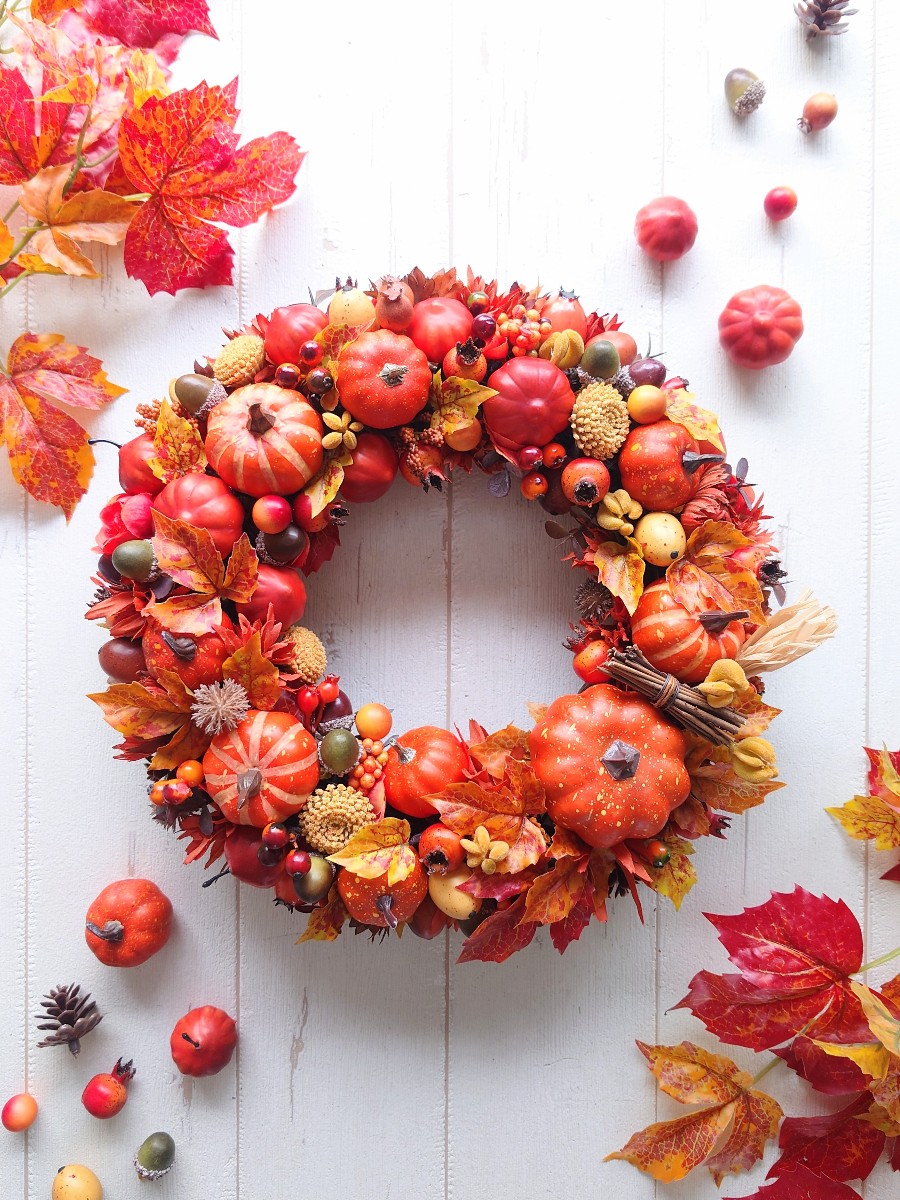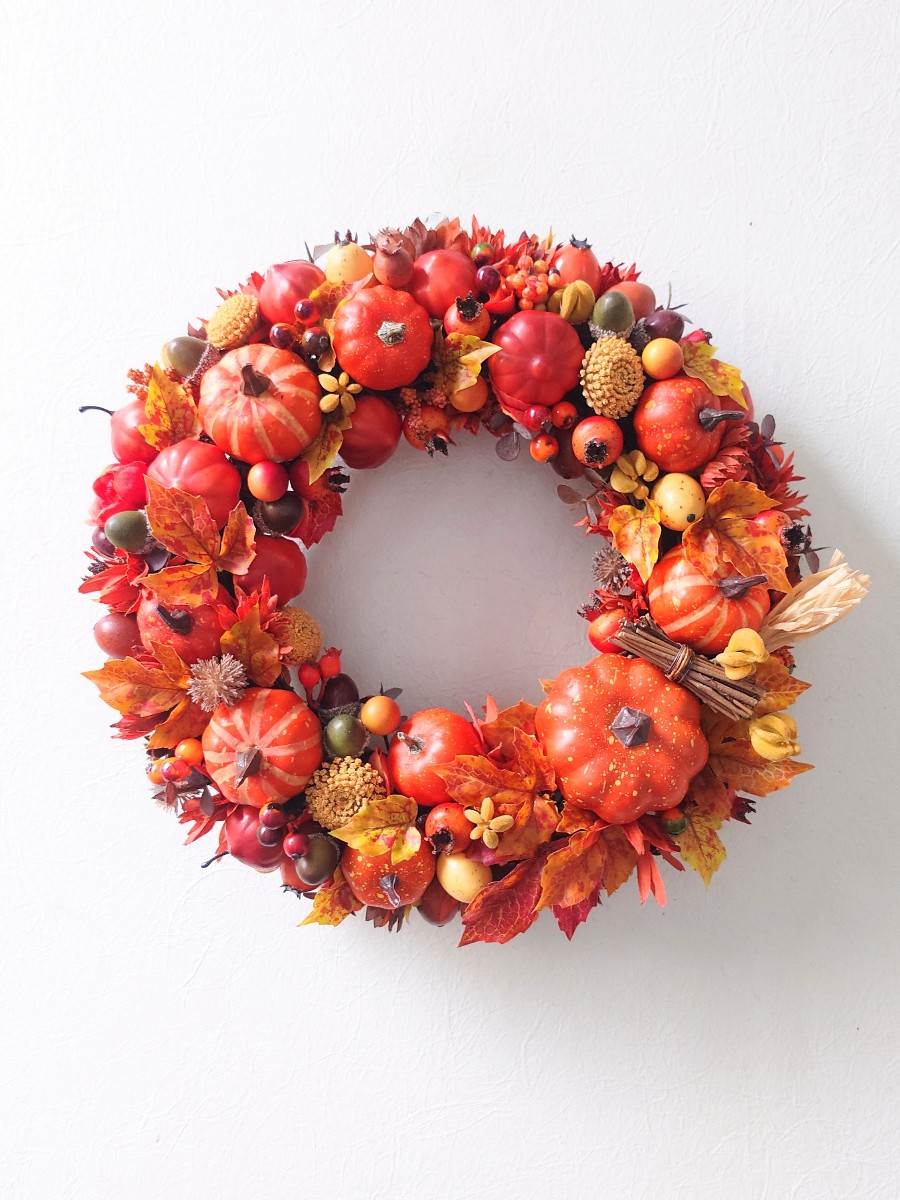 パンプキンや木の実がごろごろ入って豊かで楽しいリースに仕上がりました。