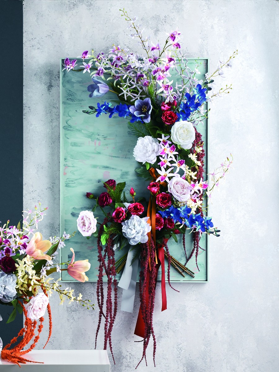 爽やかなブルーとローズの色調を活かしながら、3つのブーケを組み合わせてパネルに構成しました。絵を描くような感覚で一つひとつを丁寧に配置し、アマランサスとリボンで色彩とバランスにアクセントを添えています。ポイントの色を映えさせる為にグレーやソフトイエロー、白の花材が活躍しています 。